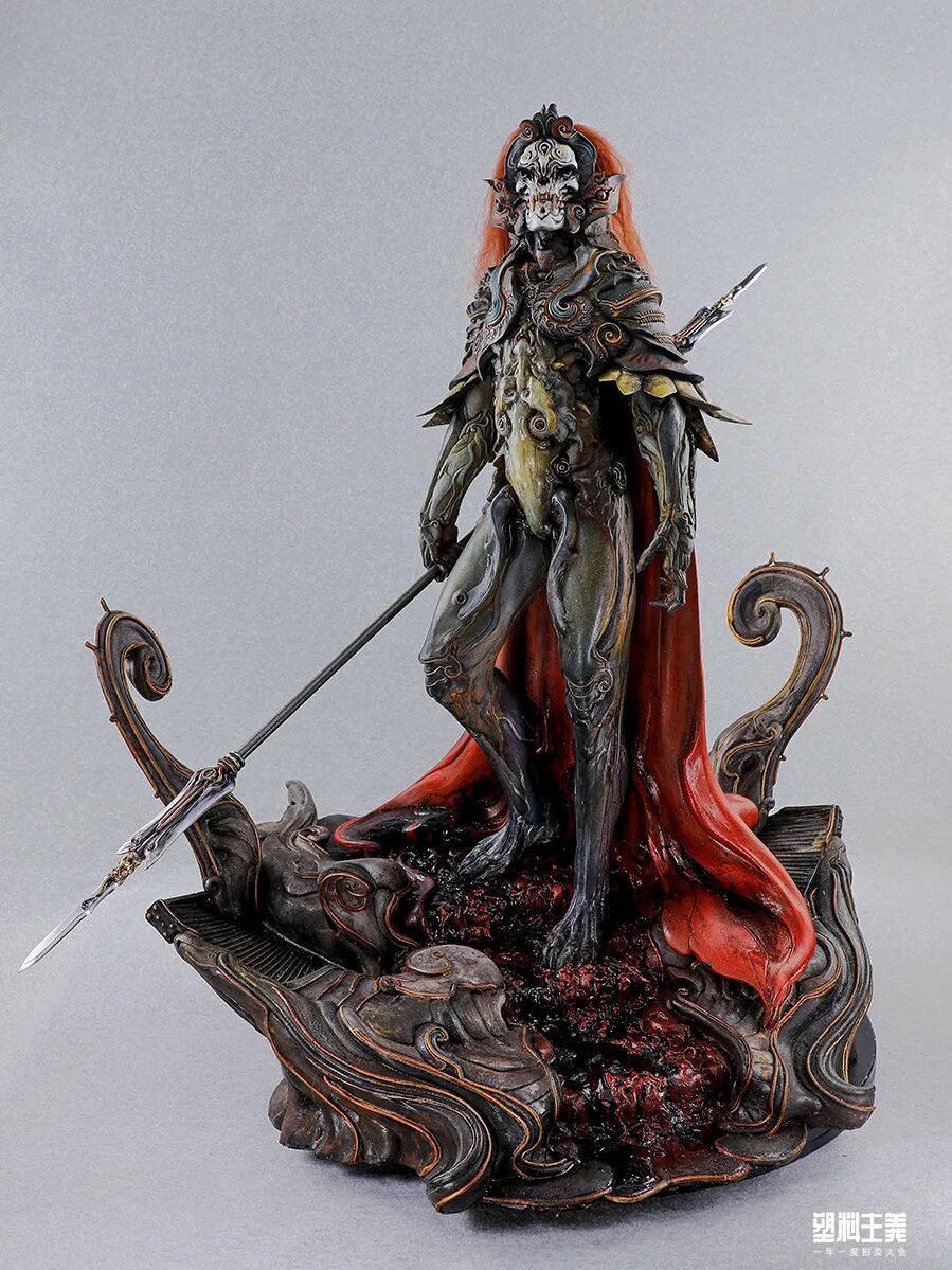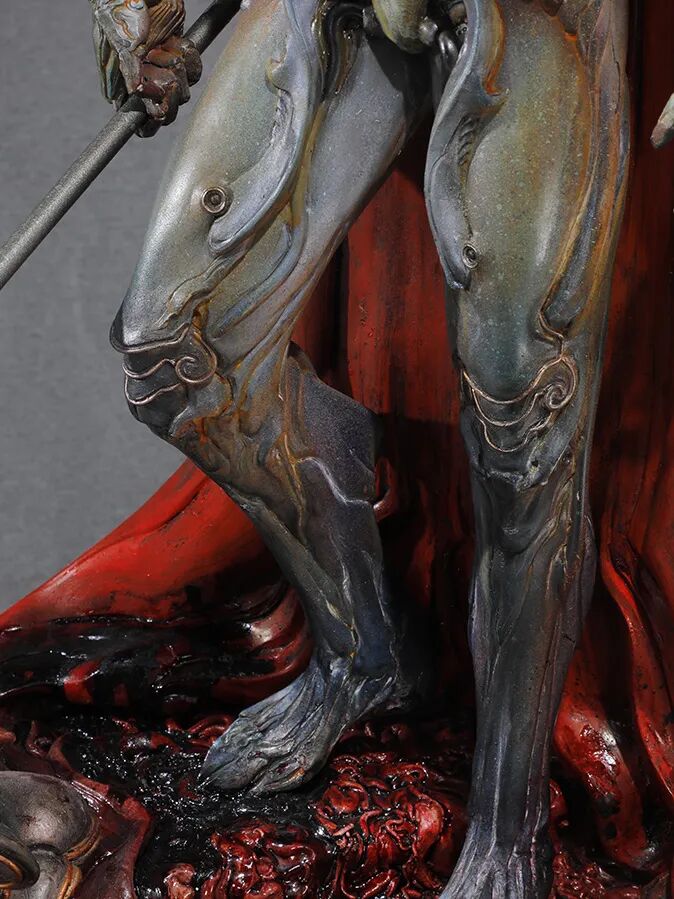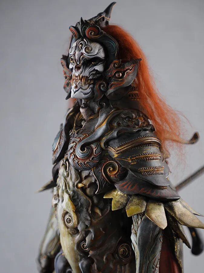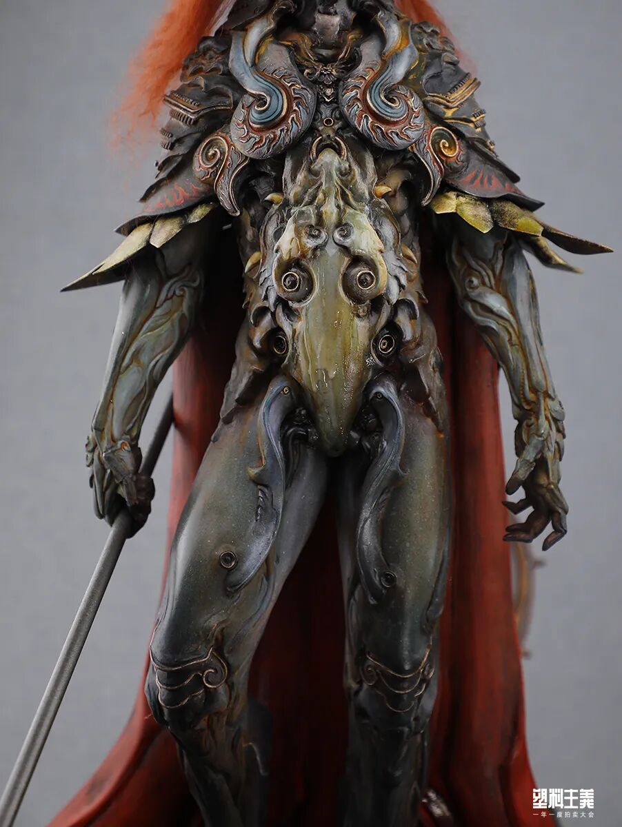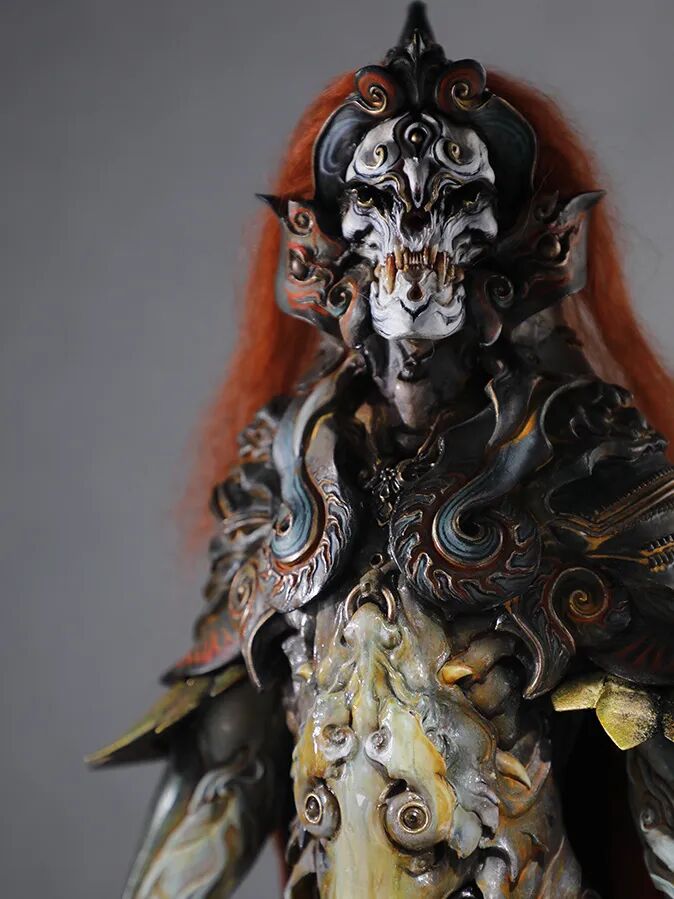 而这,恰如刀锋般切中了“鬼神”的题眼。而珍妮的二次创作,有如画龙点睛般为这作《杨戬》赋予了奇妙且狂野的生命力,她在同一组作品身上运用了截然相反的技法。京剧脸谱是写意,是张狂,是流动的艺术;而来自 gk 与特化技法的生物技法则是极致的写实,是几可乱真,是定格的技艺,两种技法合二为一,淋漓尽致地诠释在了这作《杨戬》之上:黑白如山水泼墨般的面相写照,在抒情中又带有一抹仿佛自天上来的威武;玉石般透着 HR 吉格机械血肉审美趋势的身体材质上,却又相互映照出冰山在原型上刻意加重的神秘感与神性。