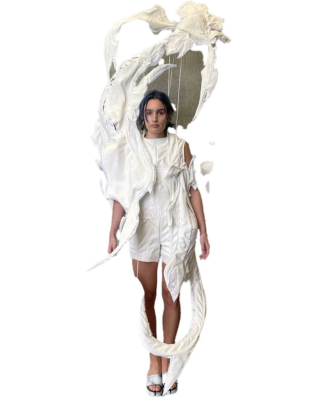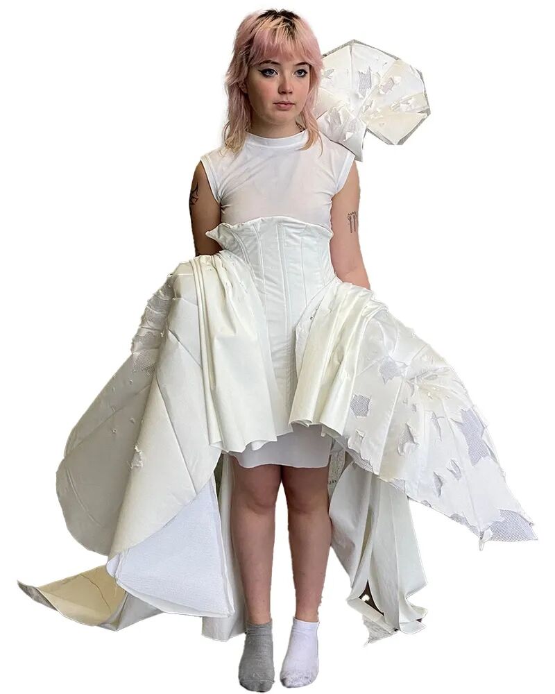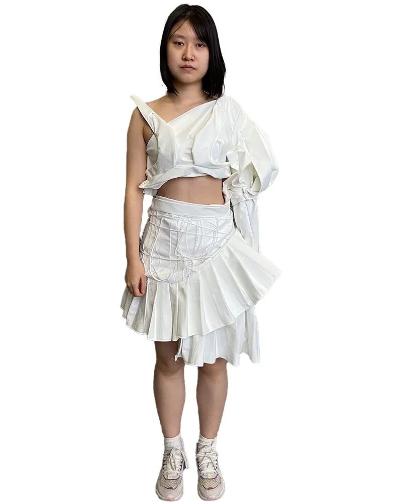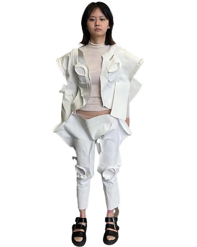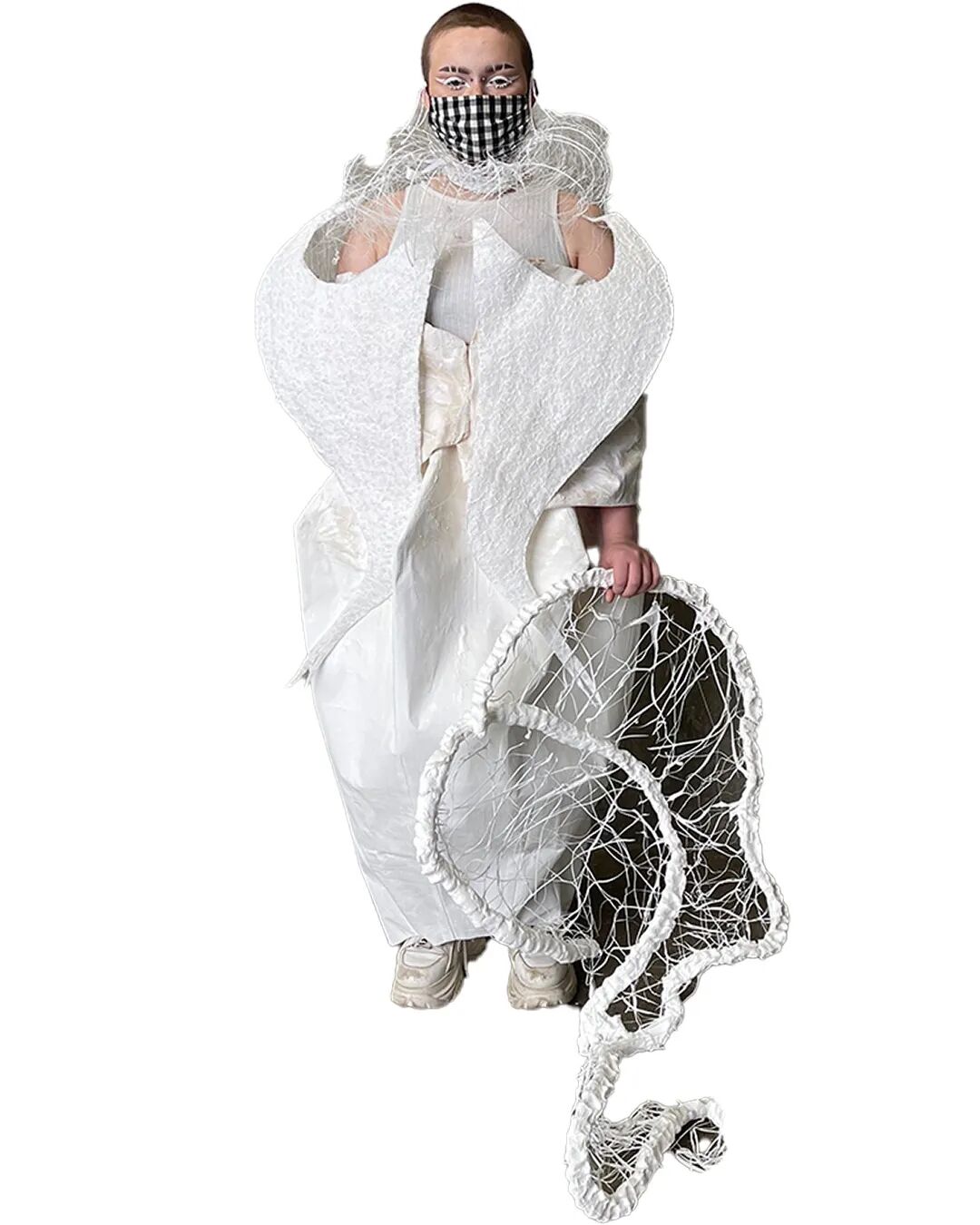 审视当下的社会现象,并从中获得启发创作出寓意深刻的作品,孕育无限可能的“白色”在学生们的手中形态万千。同学们通过雕塑,手绘,服装工艺处理等多种手法,将面料呈现出各种不同的表达与创意。