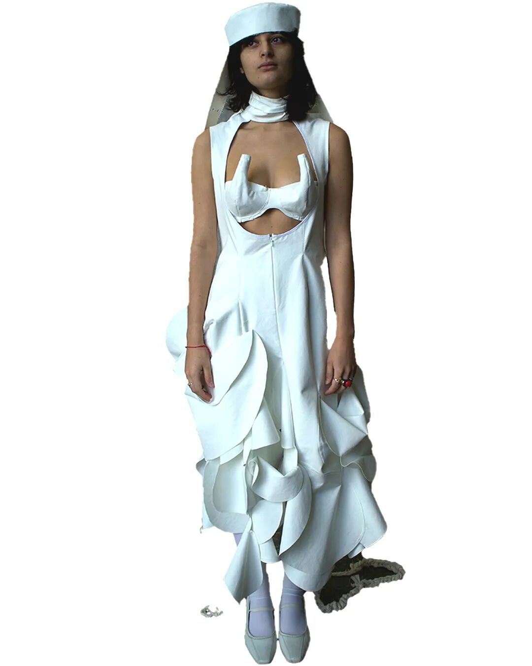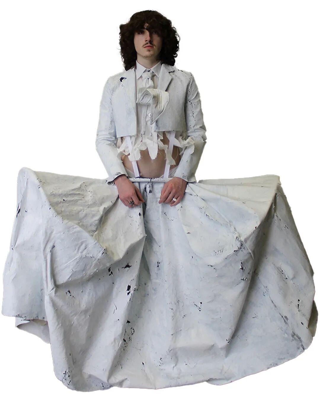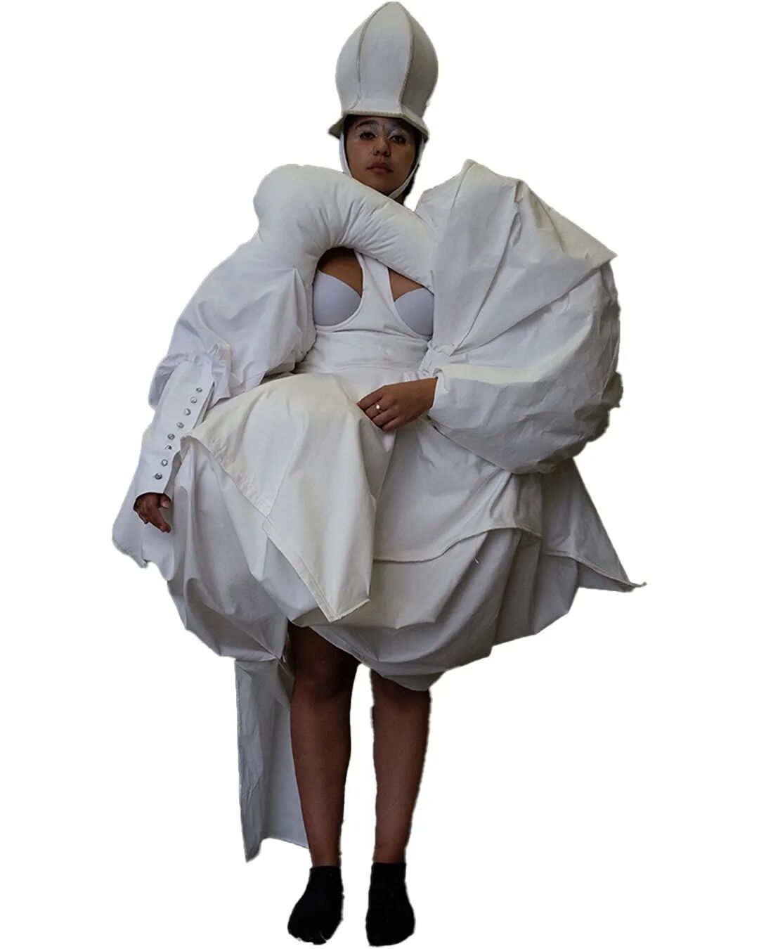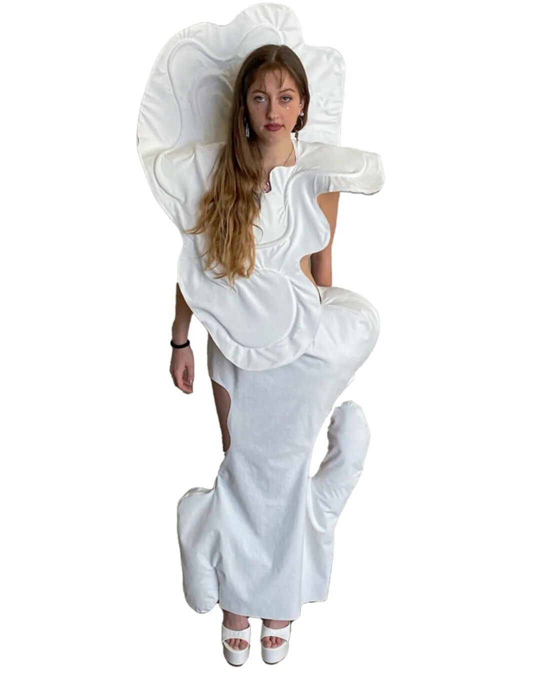 审视当下的社会现象,并从中获得启发创作出寓意深刻的作品,孕育无限可能的“白色”在学生们的手中形态万千。同学们通过雕塑,手绘,服装工艺处理等多种手法,将面料呈现出各种不同的表达与创意。