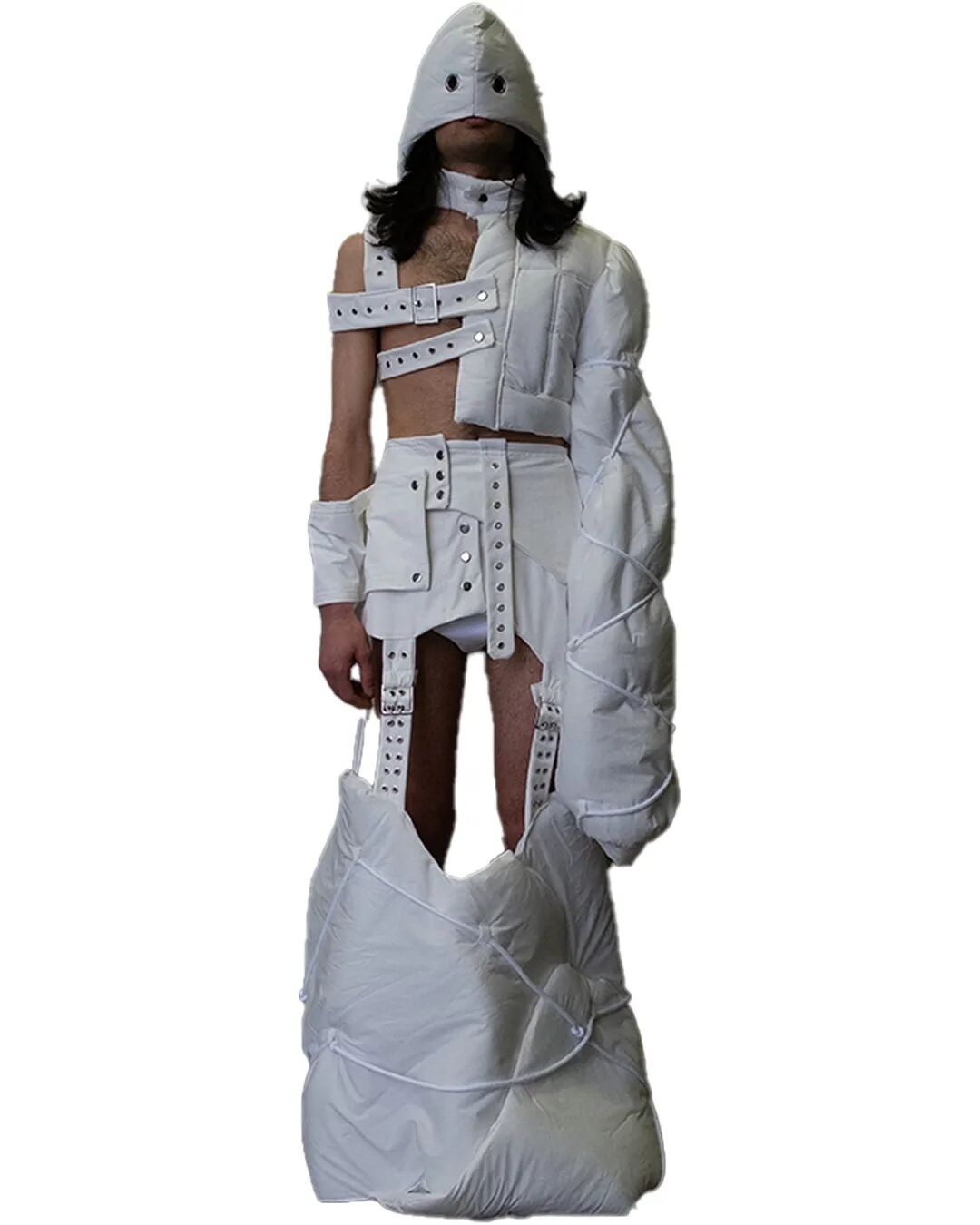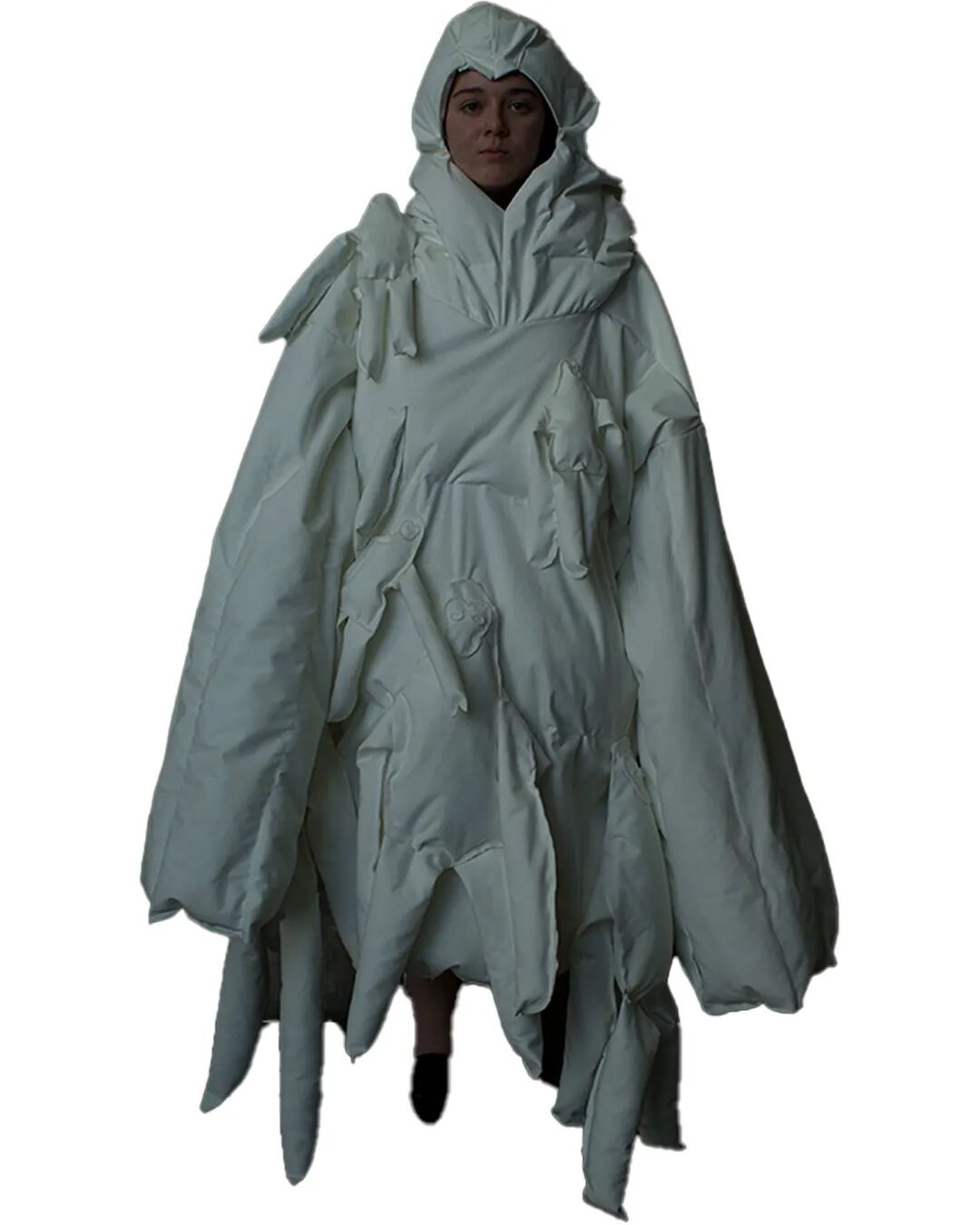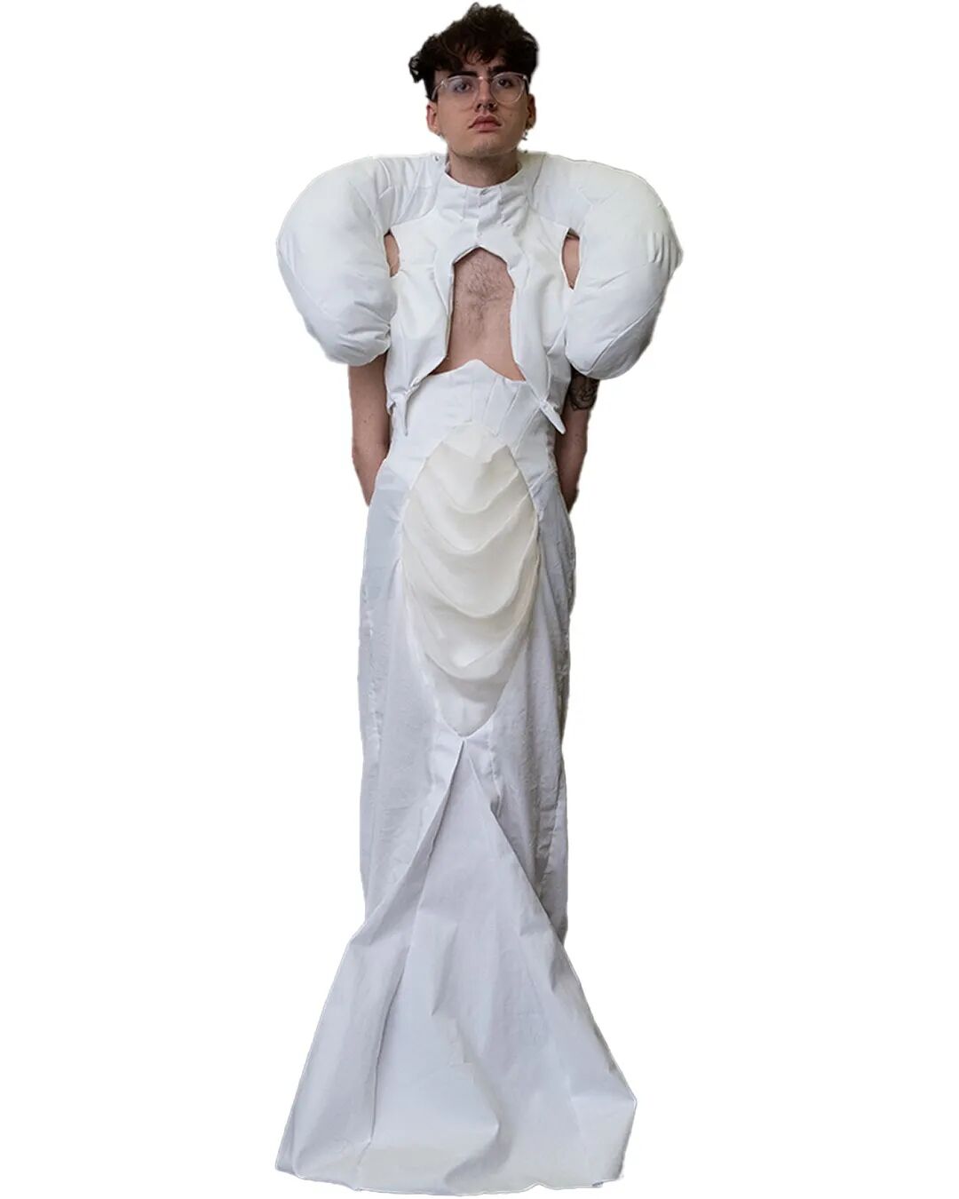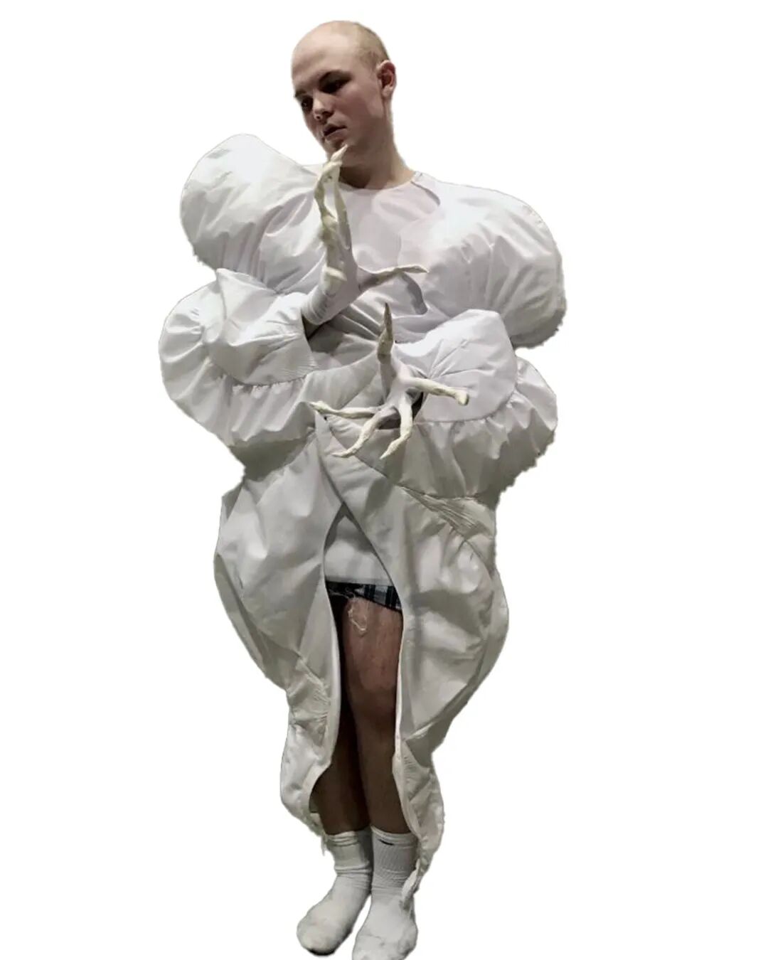 纯白的织物彷佛一张待画的白纸,又如一年级的学生一般,他们以人体为载体,勾勒着天马行空的想象。三个主题的碰撞无论是从宏观,还是微观上看都是极富意义的。