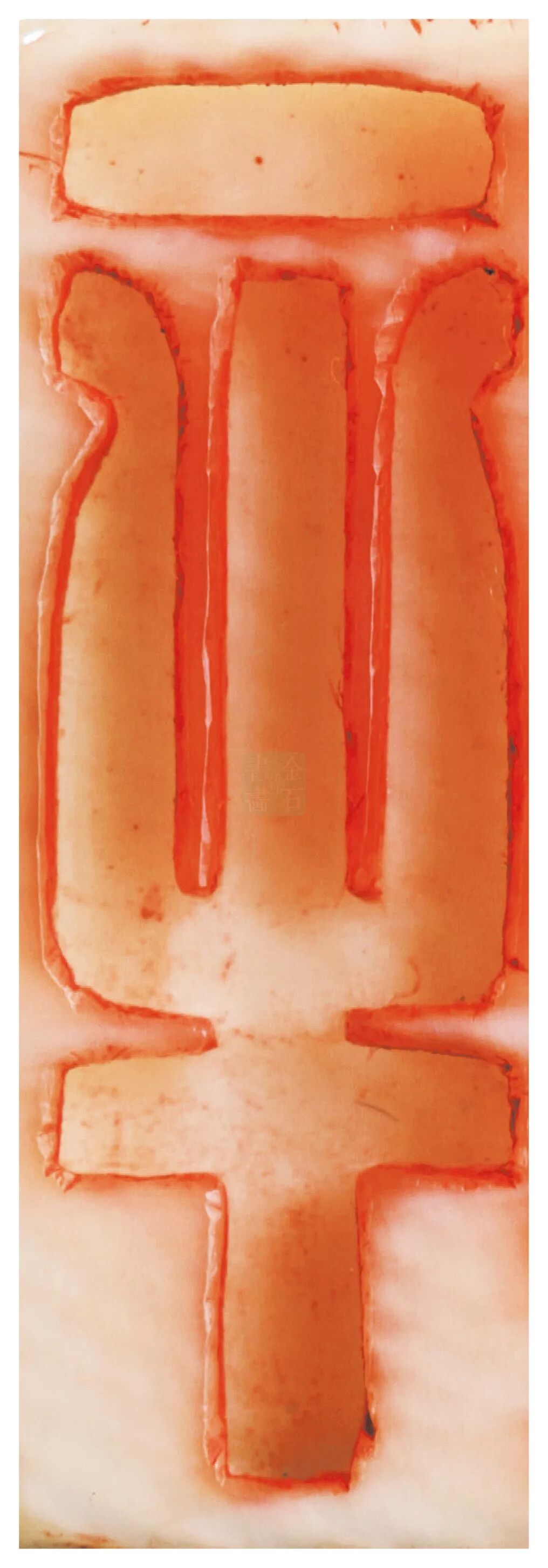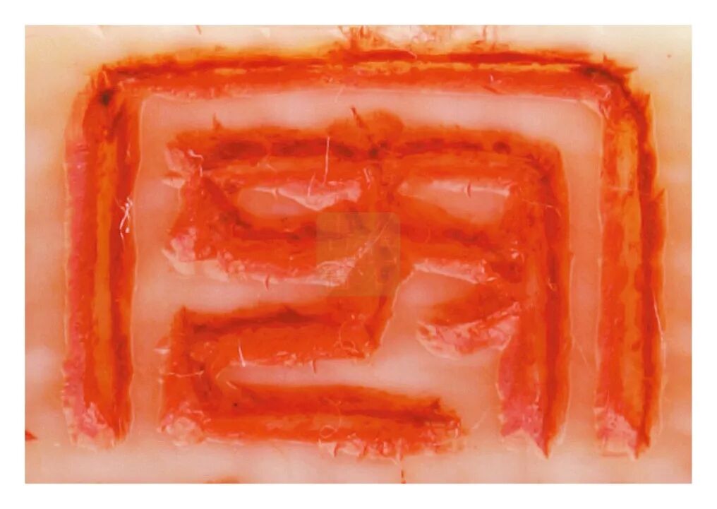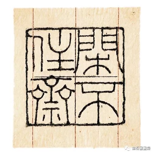据说,陈巨来设计印稿时,总会有许多平行线条,怎么做到呢?告诉大家巨翁的有效好方法在篆写印稿之前,先把美浓纸裁成比印面稍大的小纸,然后把印面朝天,盖上美浓纸,用铅笔在四周轻轻拖出印面轮廓,然后对折再对折,甚至再对折,然后用小毛笔的笔肚子在折线上轻轻一拖,留下一条极细的线。