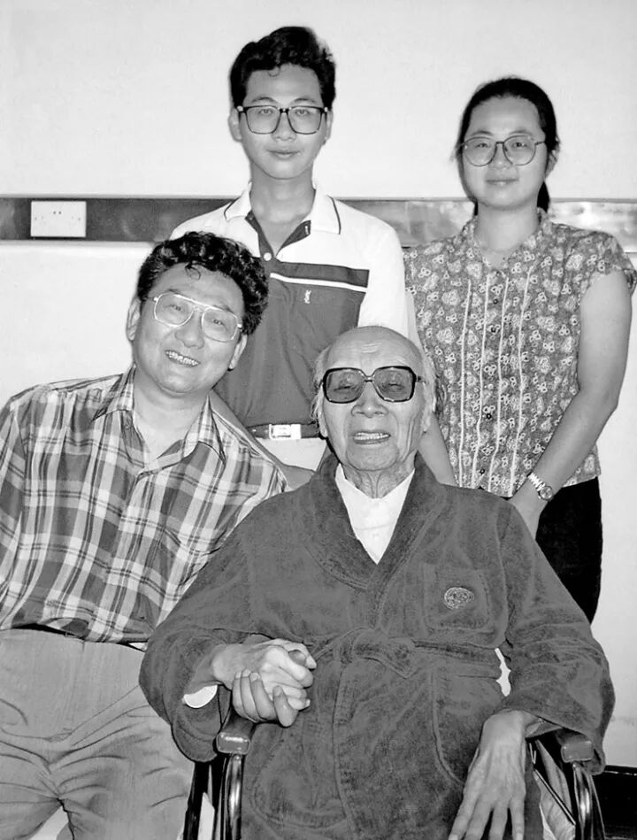 韩天衡与子女因之(后右)、回之(后左)探望病中的刘海栗(1994年)