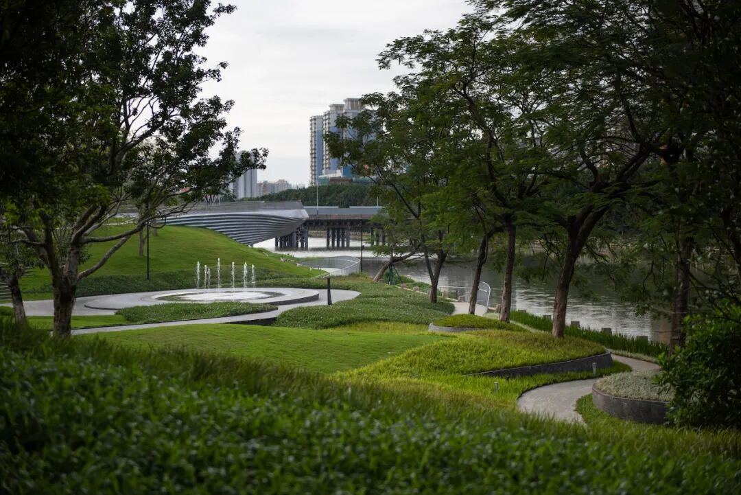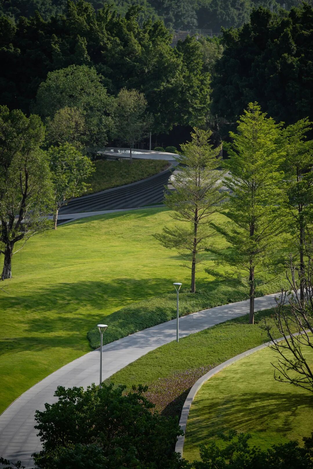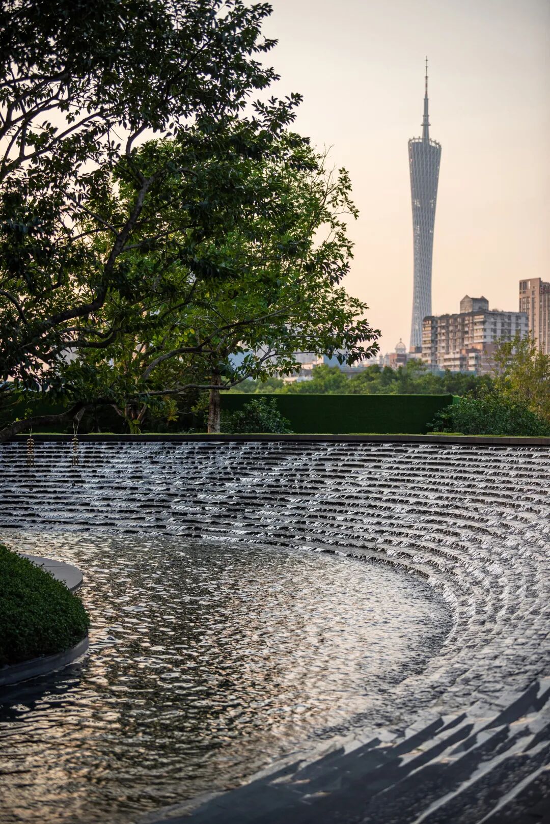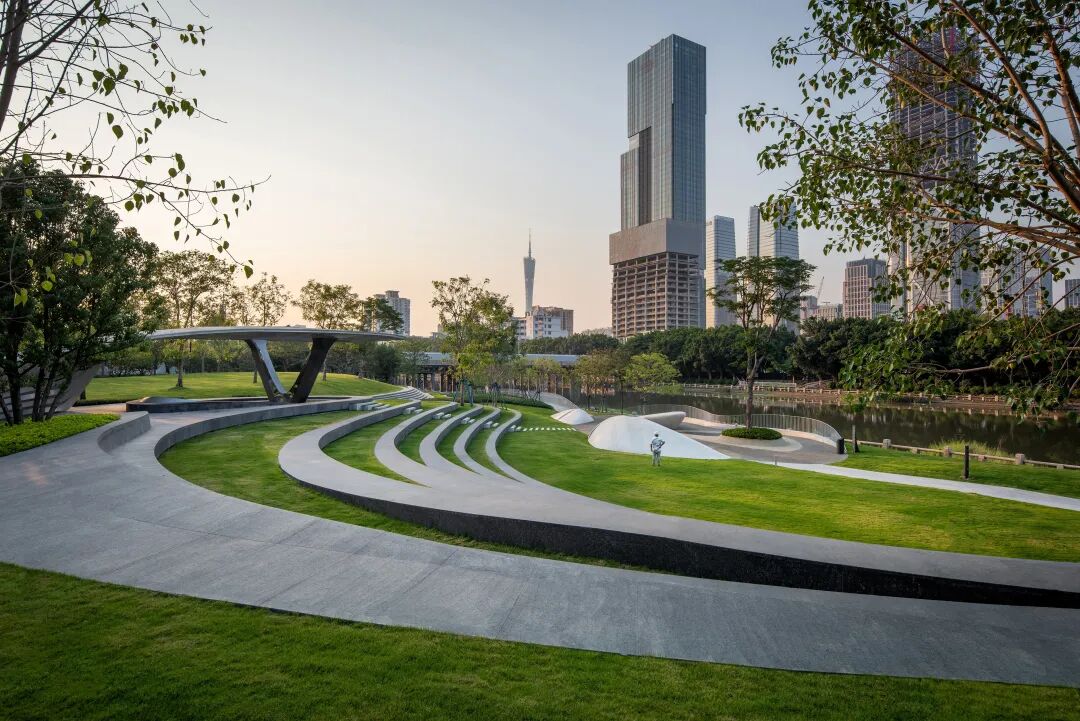 行走于浪形律动的山丘,经过原生凤凰木、大榕树等古树群落与精心配置的34种近百棵花果树种,流连生态修复后与海珠湿地公园形成带状布局的水畔廊道,让往来鹭鸟于此栖息,展现CBD中心难得一见的隐秘诗意。