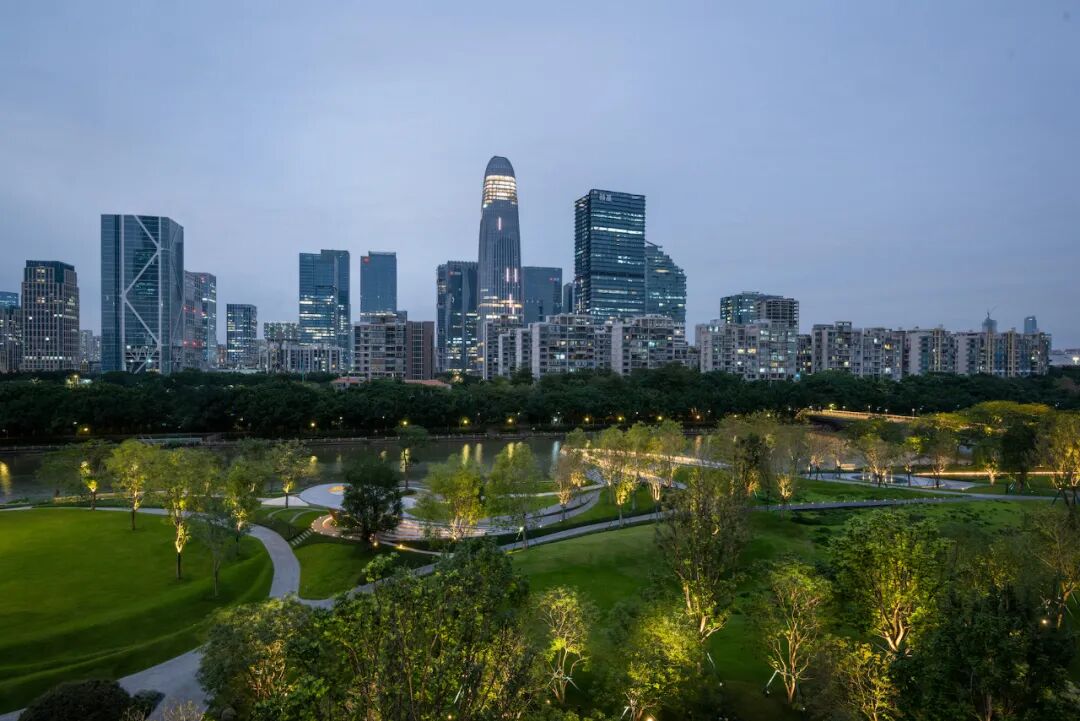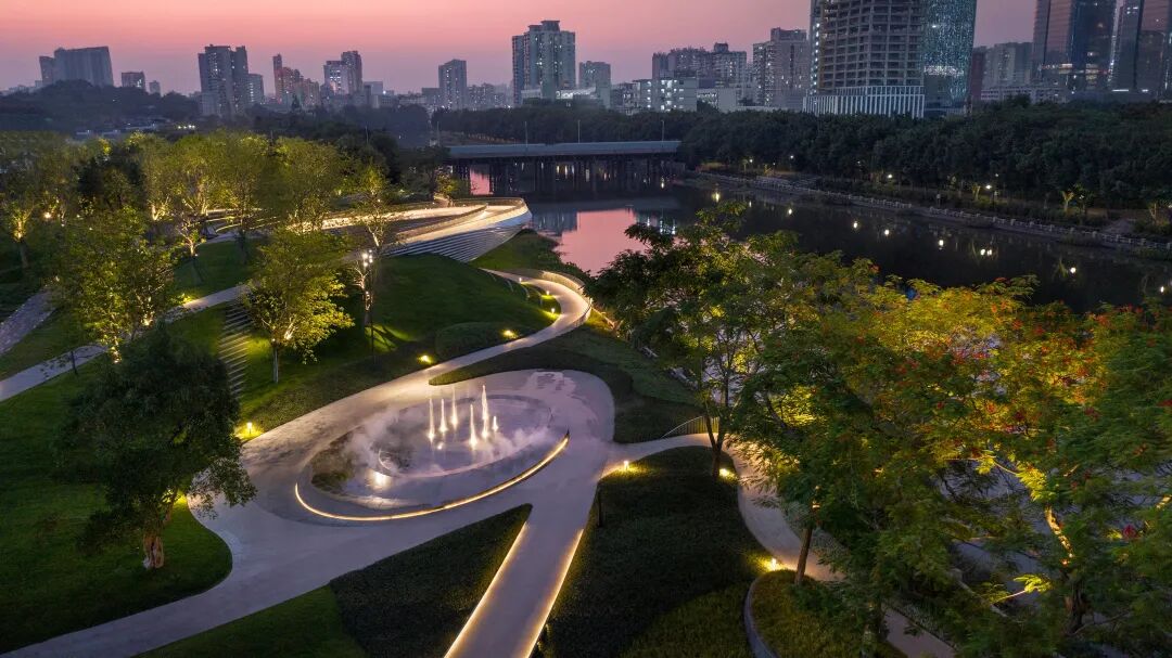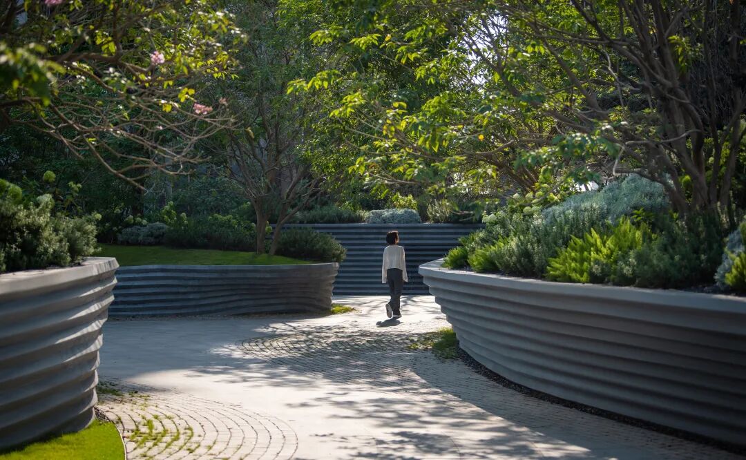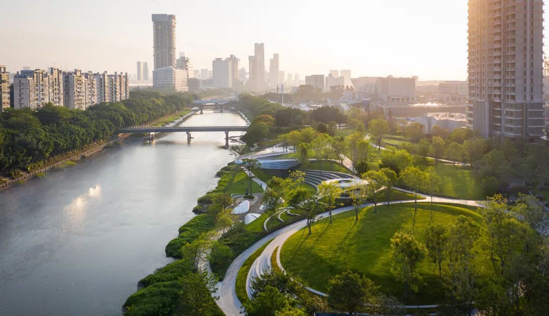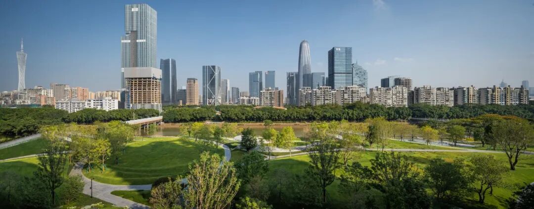 行走于浪形律动的山丘,经过原生凤凰木、大榕树等古树群落与精心配置的34种近百棵花果树种,流连生态修复后与海珠湿地公园形成带状布局的水畔廊道,让往来鹭鸟于此栖息,展现CBD中心难得一见的隐秘诗意。