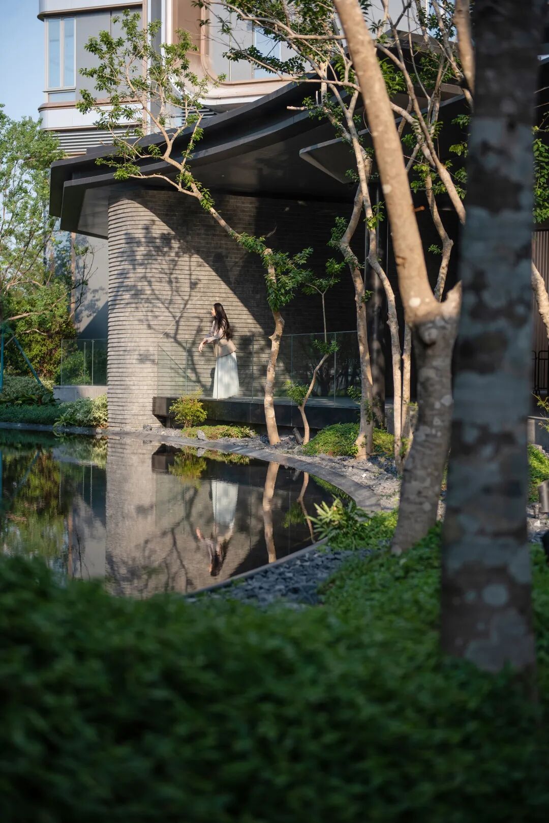 入口处如都市山谷般雕琢的优雅线条,退台式设计营造水幕剧场式的沉浸生活语境,依水而生,大隐于市,从公园景观到建筑室内进行连贯的回响与呼应。