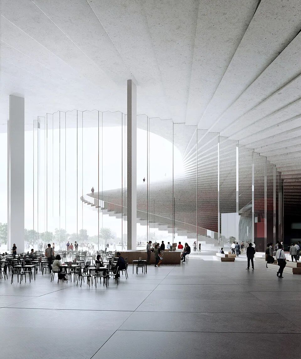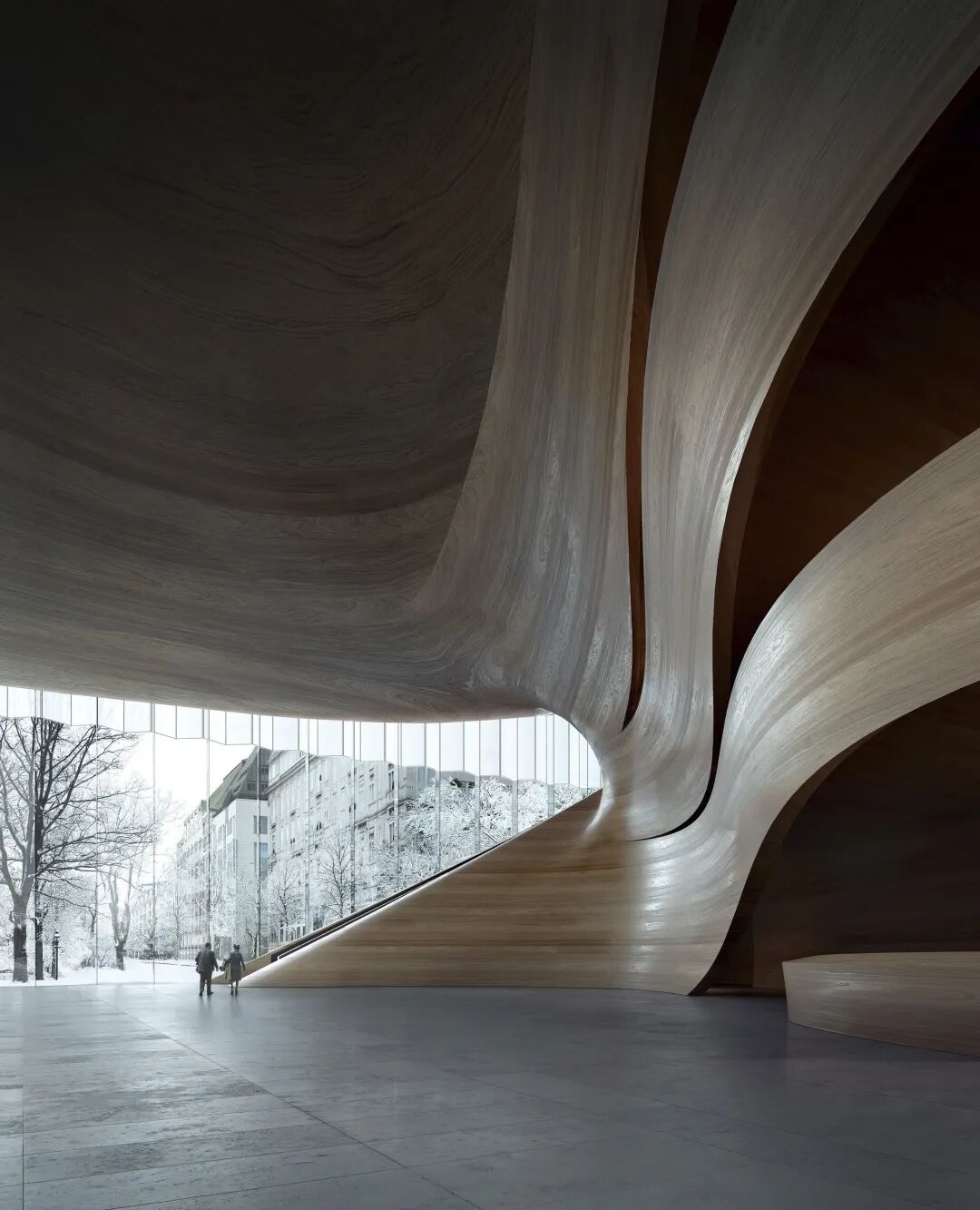 从公园走进门厅和主入口,室内和室外的界限变得模糊,将门厅和公园融为一体。走在清晰的花岗岩石地面上,16米高的透明玻璃立面展现了门厅内的雕塑木墙。