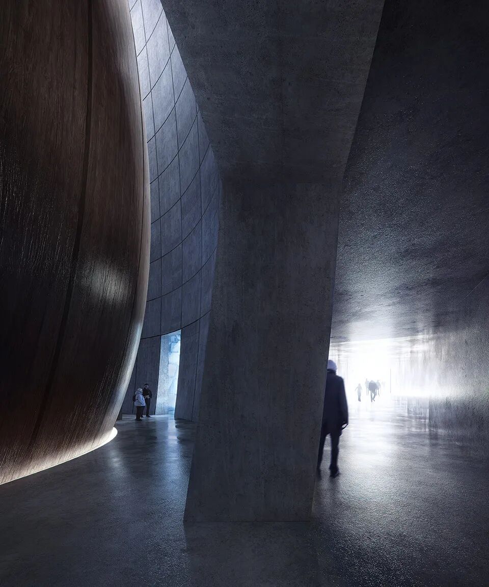 游客中心通过桩基悬空于地面,深色的烧制木材和玻璃相得益彰,令整个建筑更加轻盈灵动。展览楼的体量与之形成巨大的反差,形如种子又似巨石的白色有机体与覆雪的外立面相呼应,并通过VR体验、触摸屏等现代技术展示珍贵的藏品,鼓励人们共同参与世界资源的保护。
