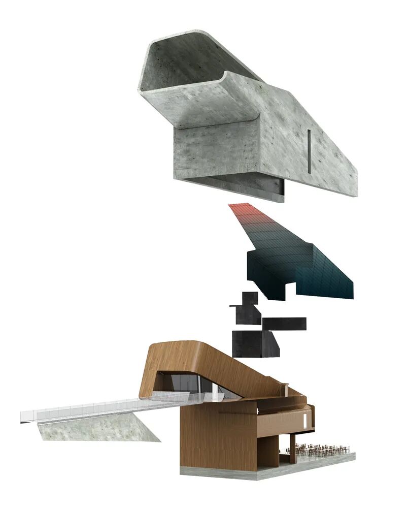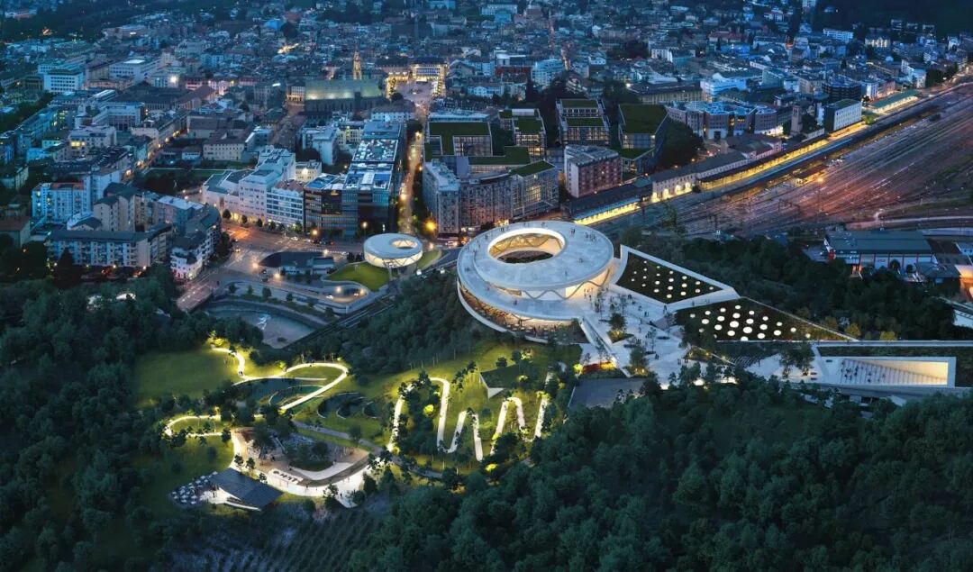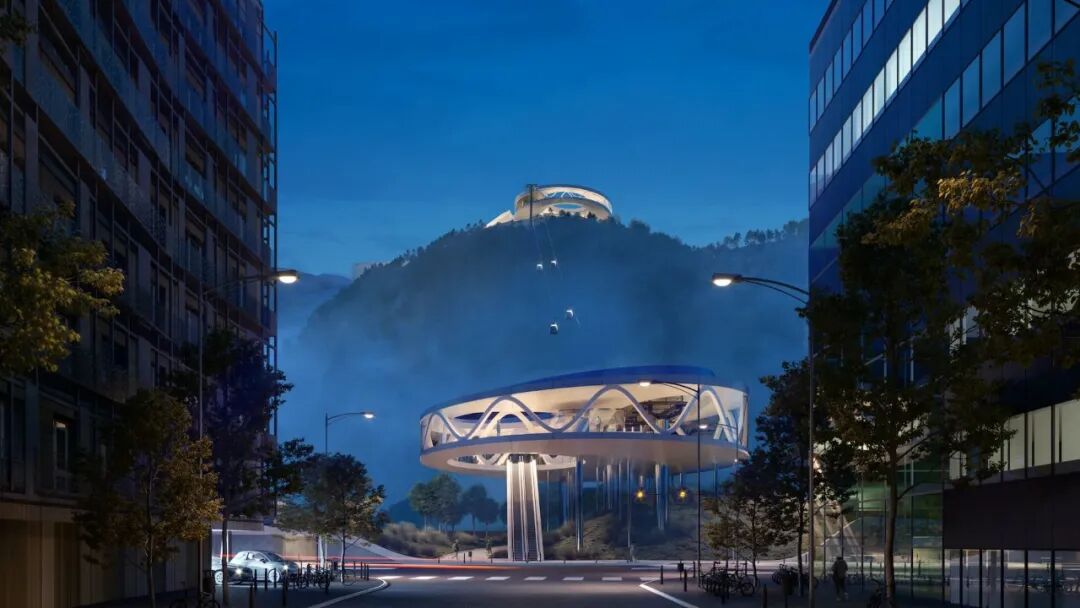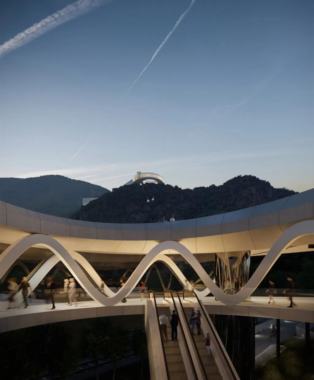 Snøhetta 在山脚下和山顶各设计了一个环形基站。缆车运行在两个基站之间。在山下的建筑设计中,是要将自然景观引入到城市中来。在山的顶部,基站将建成一个”城市与自然的连接站” - 这里不仅仅只是能观赏风景,而且还有众多服务设施,餐厅,咖啡馆,无边界泳池和会议室,除此之外,设计师还设计出了“山顶广场”,就像一个露天市场一样可以举办各种活动,或音乐表演。
