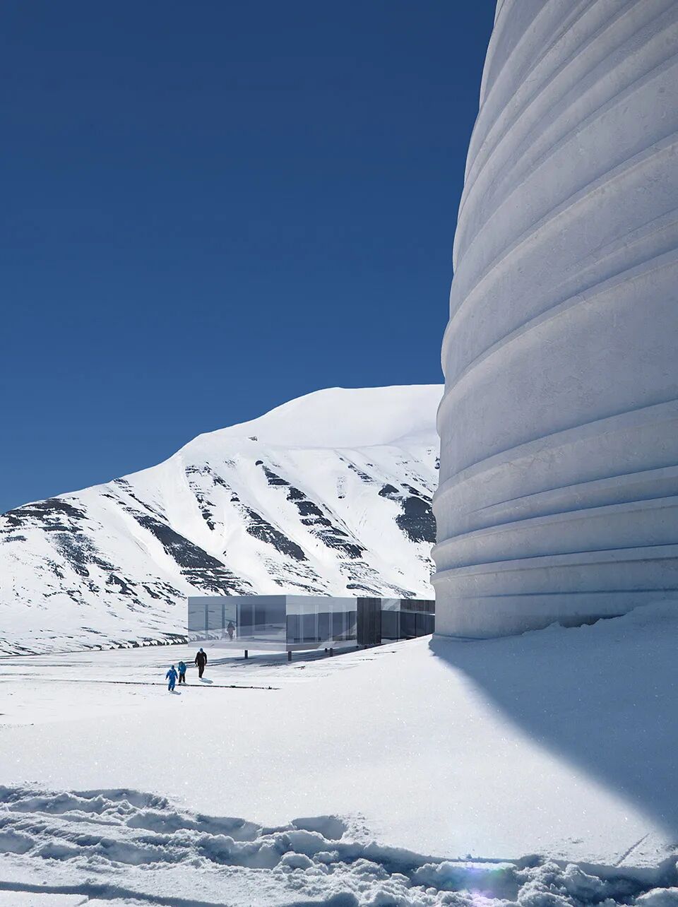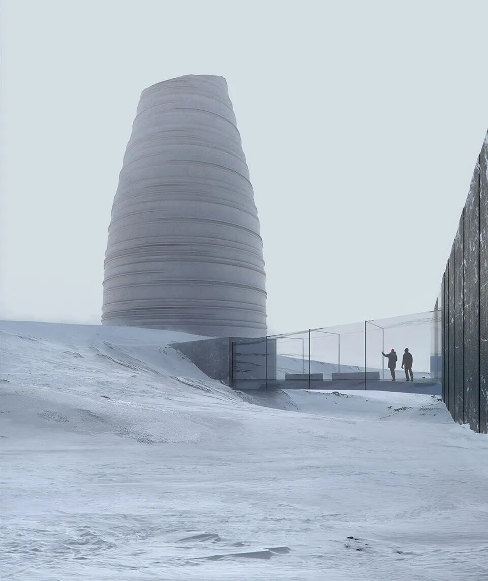在赤道以北78°的朗伊尔城,Snhetta设计了一个名为The Arc的种子保护与储存中心,向游客展示Svalbard全球种子储存库和北极世界档案馆的内容。展馆分为游客中心和展览楼两个相对独立的体块,并在形式、材质和色彩上有着明显的差异对比。