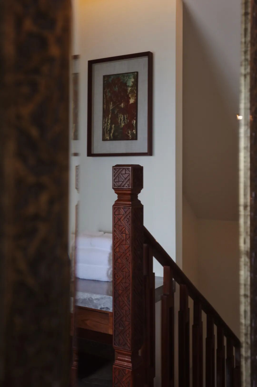 在阳台可以看到海的房间,潮湿的风裹挟着海洋的气息吹拂纱帘,这里的闽南风韵浓郁。由珍稀名木制成的床背、镶板和楼梯扶手等,在海风的荡漾下,也为整个房间带来富庶的特质。