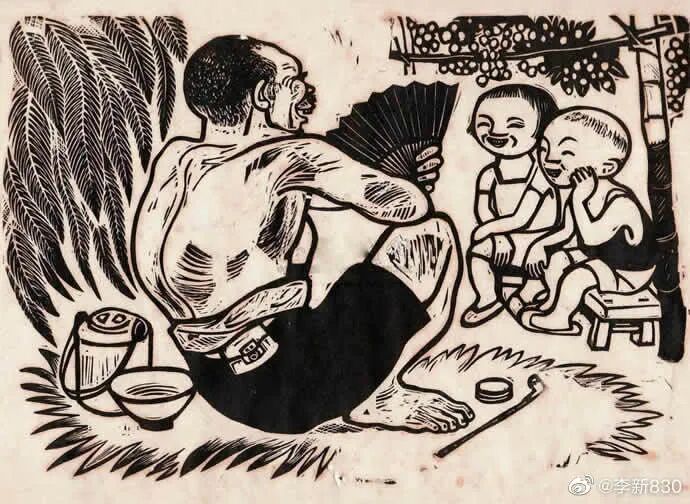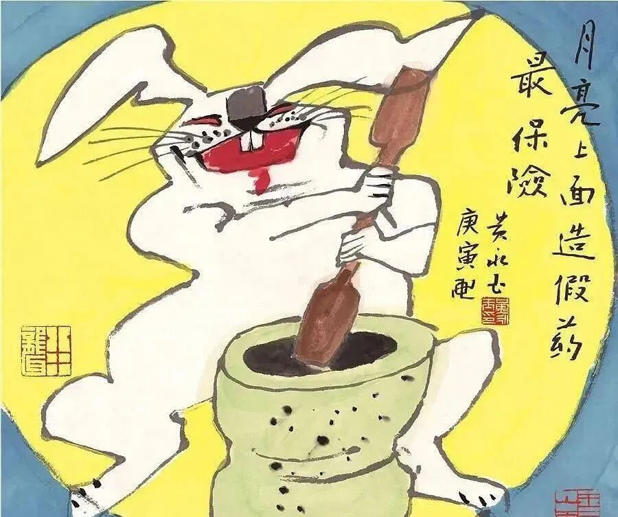 传统的玉兔捣药,他用来讽刺造假的黑心商家,配文“月亮上面造假药最保险。”