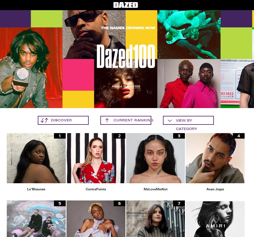 全球最具代表性的英国青年文化杂志《Dazed》,从2014年起,每年都会举办名为 Dazed100 的排行,评选出为青年文化注入影响力的代表人物。