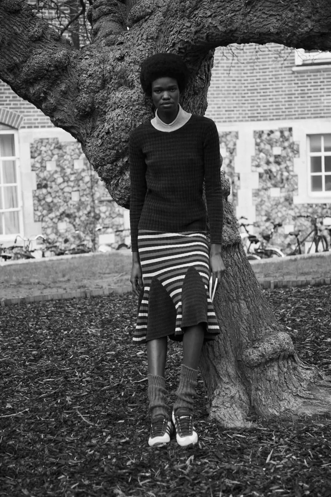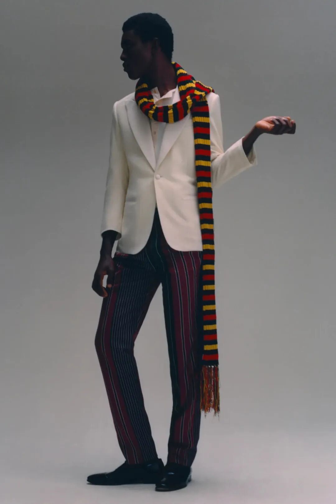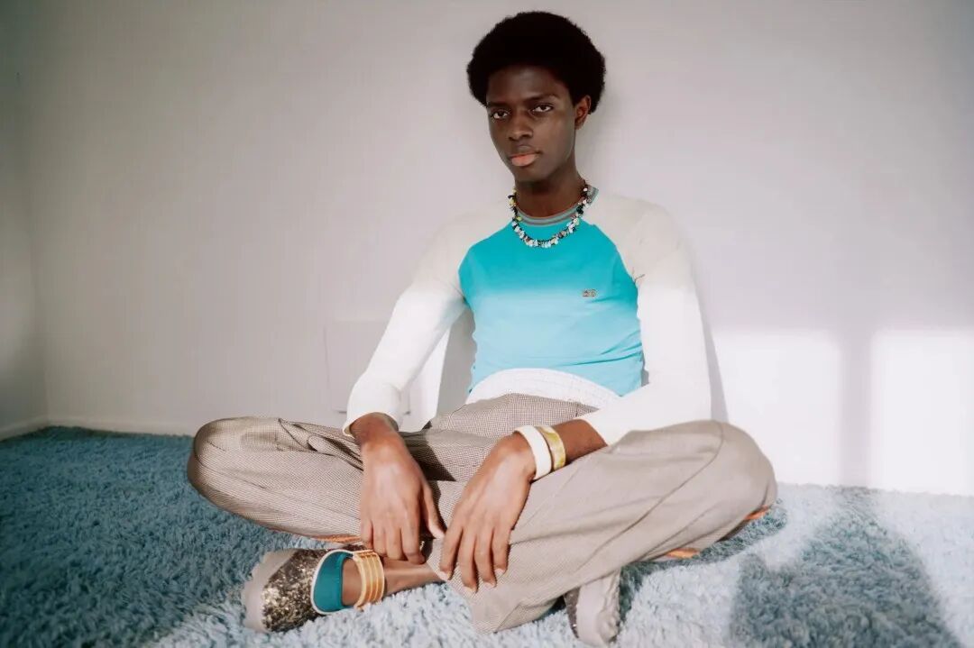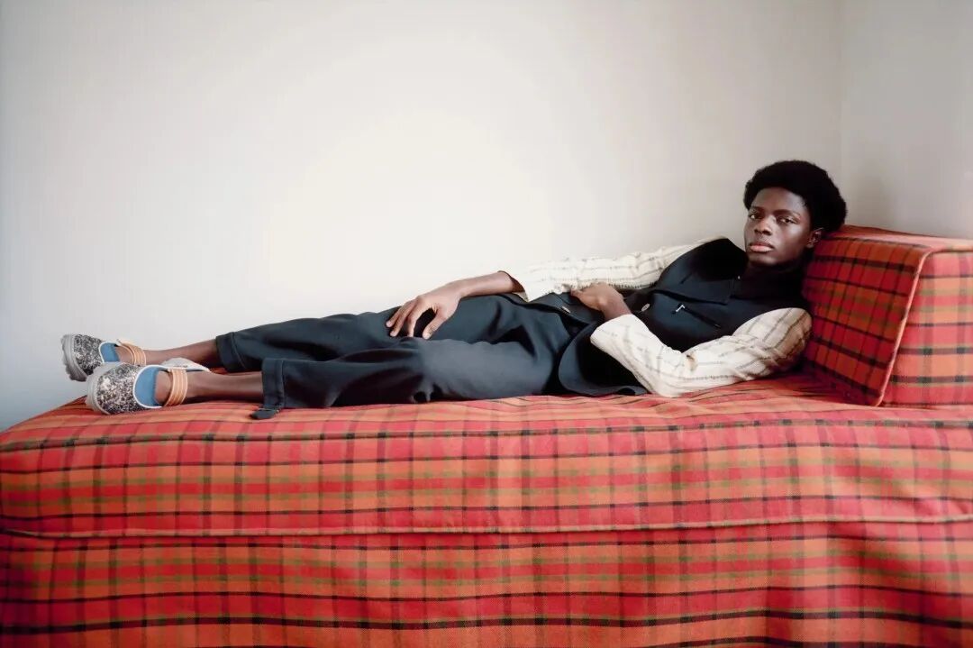 她探索20世纪80年代英国黑人学者的衣橱:那些从世界各地到牛津和剑桥等大学学习的人。他们的学术装束被重新想象——斜纹软呢外套和针织围巾,破旧的短裤和条纹连衣裤,但在这种历史主义中,“我在思考在某些空间人们如何为自己创造一种语言”,Wales Bonner 说。