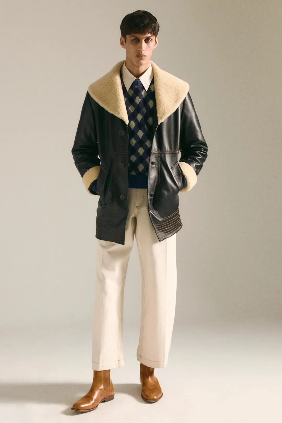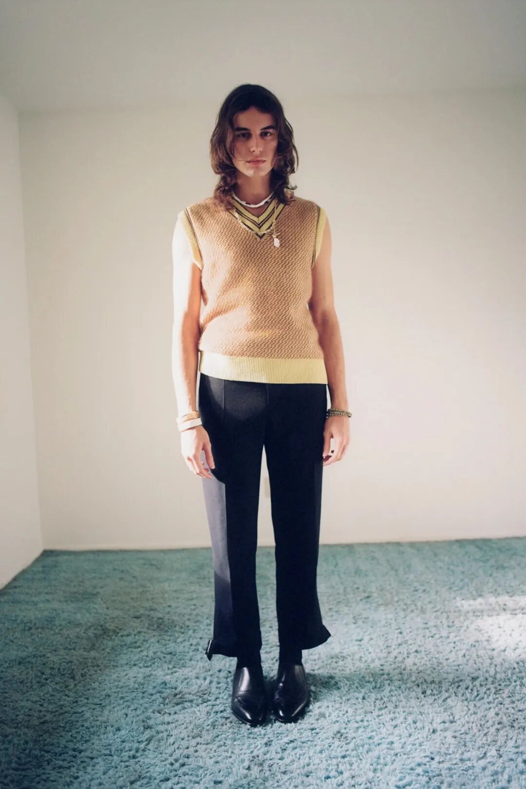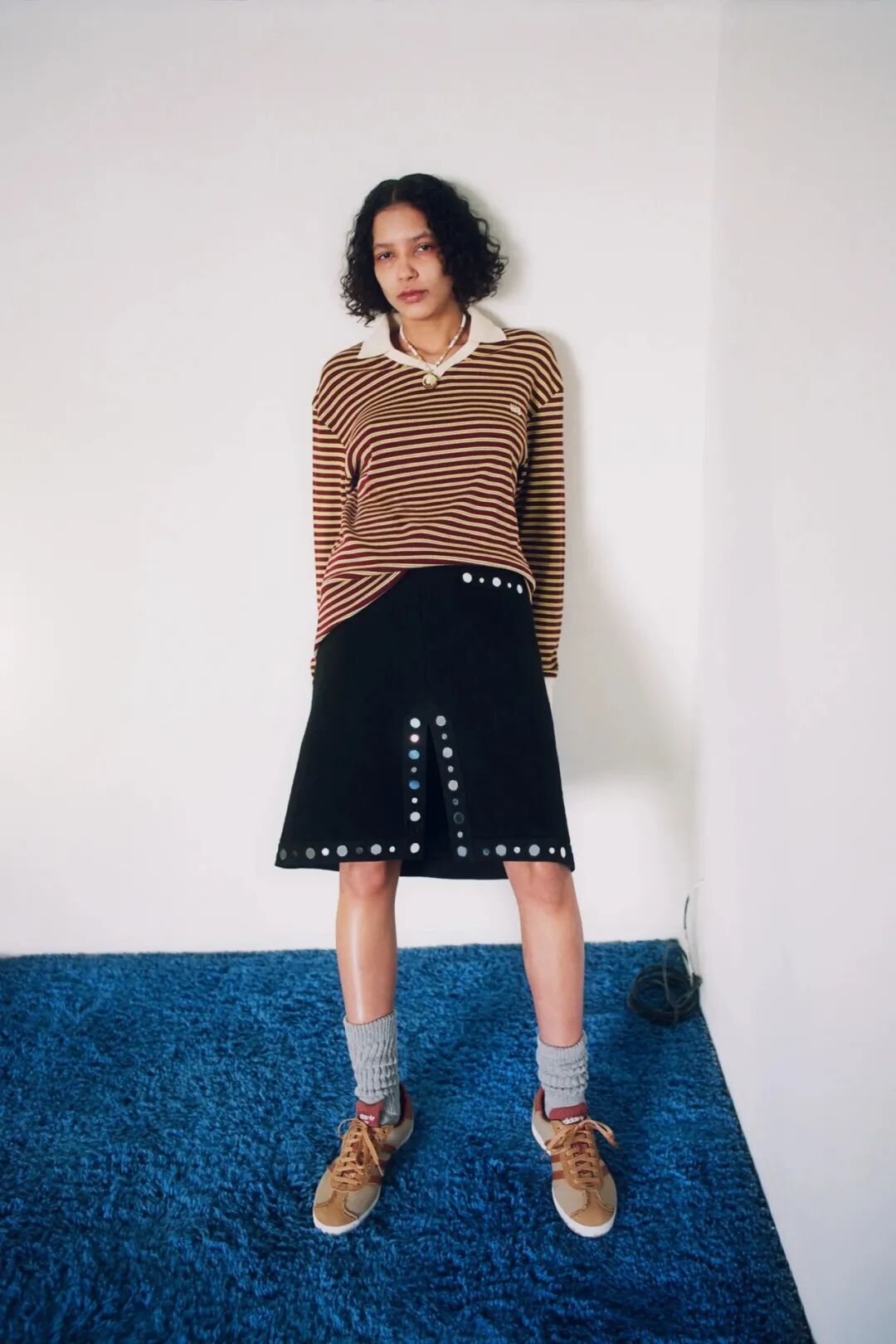 她探索20世纪80年代英国黑人学者的衣橱:那些从世界各地到牛津和剑桥等大学学习的人。他们的学术装束被重新想象——斜纹软呢外套和针织围巾,破旧的短裤和条纹连衣裤,但在这种历史主义中,“我在思考在某些空间人们如何为自己创造一种语言”,Wales Bonner 说。
