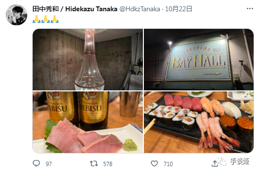 值得一提的是,田中秀和被逮捕前的最后一条推特在秀他前往横滨BAY HALL的图,以及他所享受的美食。