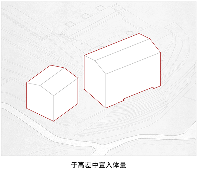建筑用地是由三个宅基地组成,两个宅基地位于西侧,一个宅基地位于东侧下端,在东西方向上有将近3米的高差,刚好建筑就形成了两个主体量,中间用一部半通透的楼梯廊道连接两边。