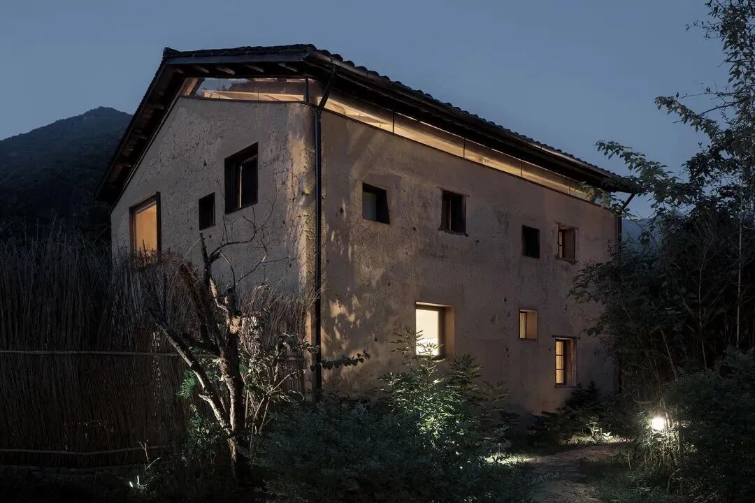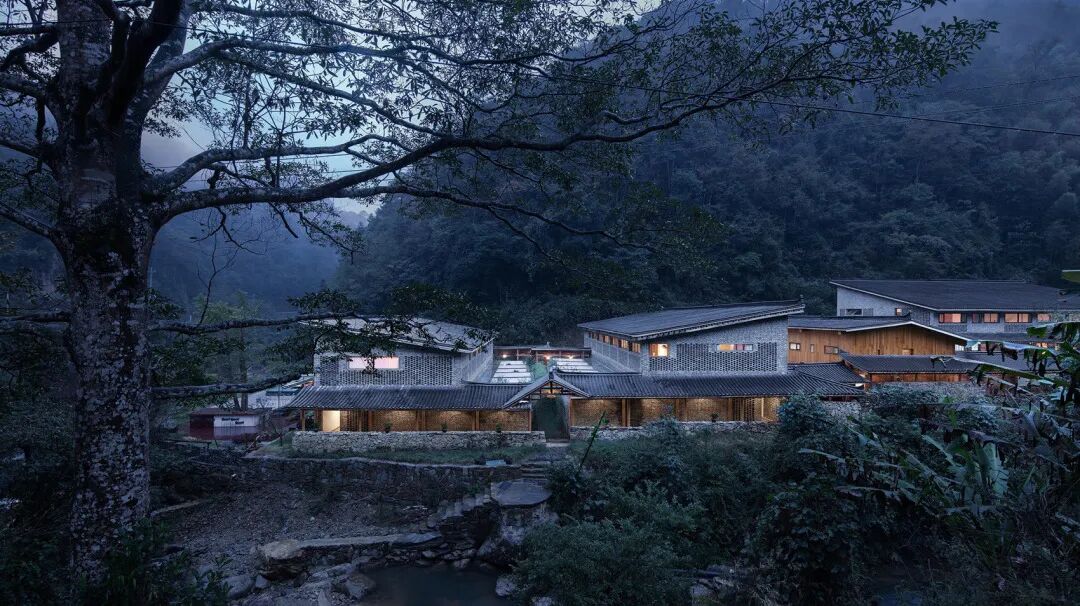 这个民宿是由一个山村中被遗弃多年的小学改造而来。它由四排砖木框架房屋组成,以重复的方式排列,周围环绕着高墙。