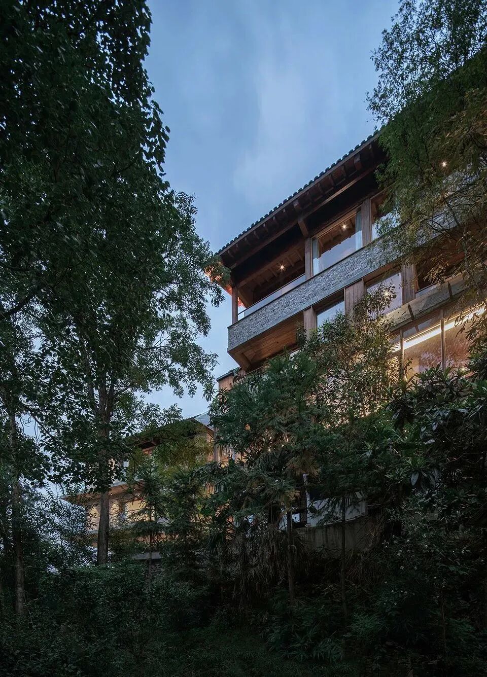 整个建筑各个部分都在尽量的与自然、环境连接,周围的树木、相邻的房舍、远处的山屏等等都映入眼帘,人们融入其中,可以得到完全的放松