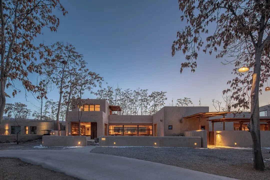 民宿在材料上选用了黄泥和西北特有的砂岩红分别用于室外与室内,整个建筑热烈又朴实,强烈的西北沙漠风格,像从乡野中生长出来的,十分协调的融入到了大漠环境中,与整片宿集一起还原出大湾村当年的风貌。
