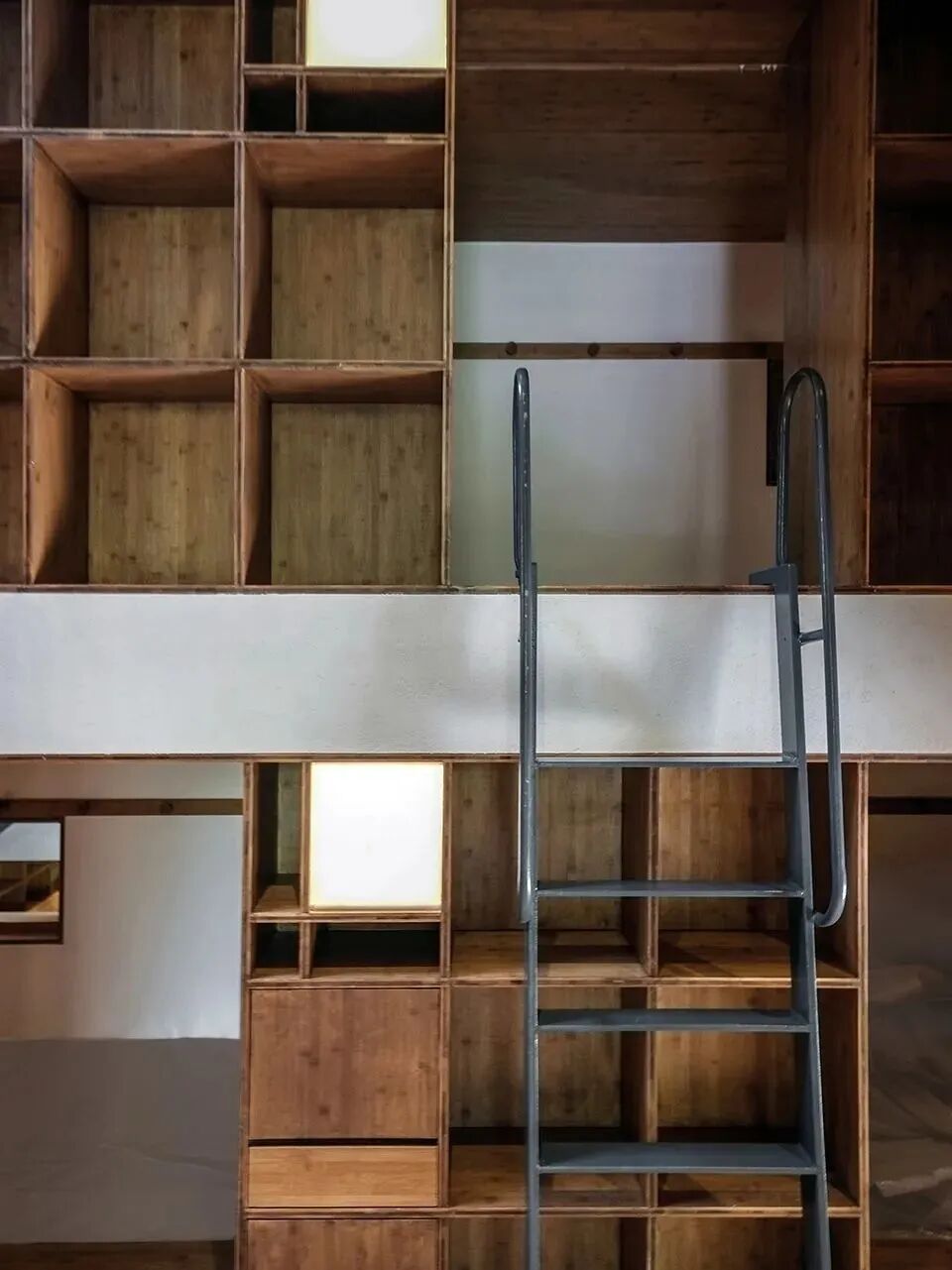 男女楼各配有10个胶囊和一个卫生间,尺寸统一的模块式胶囊客房隐藏于围合的书架之内,形成更为私密的空间。