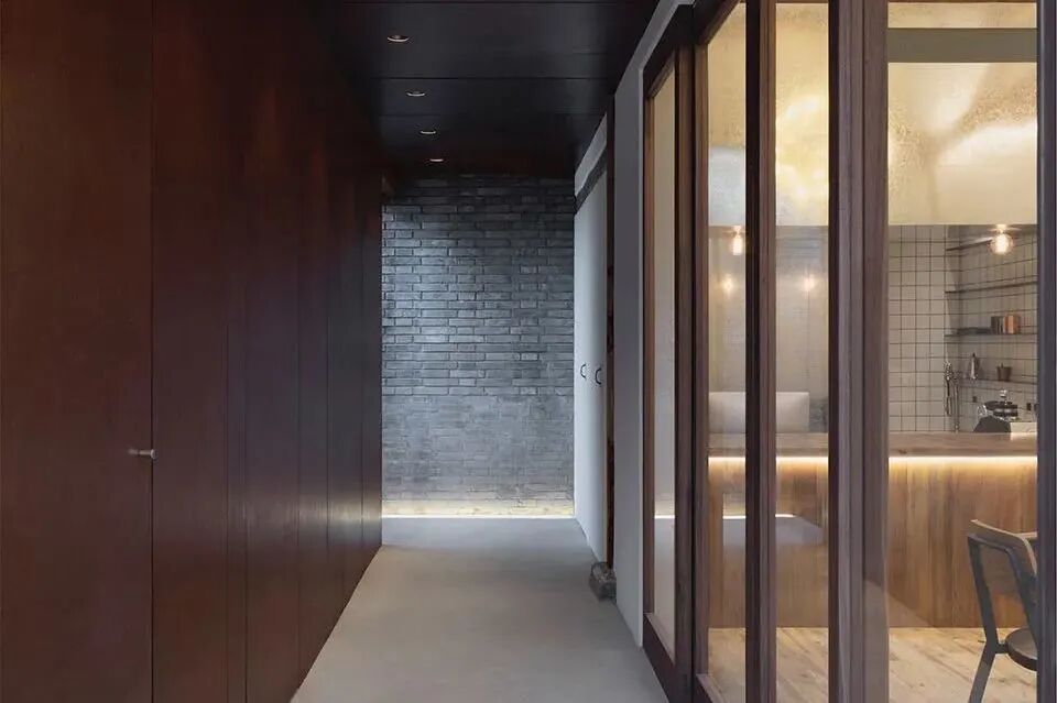 从建筑入口进门首先是一条笔直的廊道,右侧是对公众开放的咖啡馆,廊道尽头是内院的大门。院内共设计6间客房,其中3间是loft格局的小客房,另外3间为大客房。除客房外,其余室内空间均为公共空间。