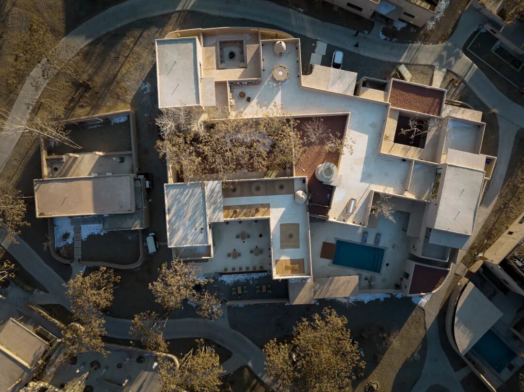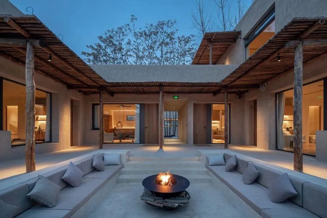 民宿分为三个院落,其一是名为“空山九帖”的书店和茶饮空间,对外开放;另两个院落拥有11间客房。对建筑进行围合改造设计后,每个院落都拥有个性鲜明的公区,比如户外咖啡区、泳池、树林庭院、下沉式火塘、空中露台等等。