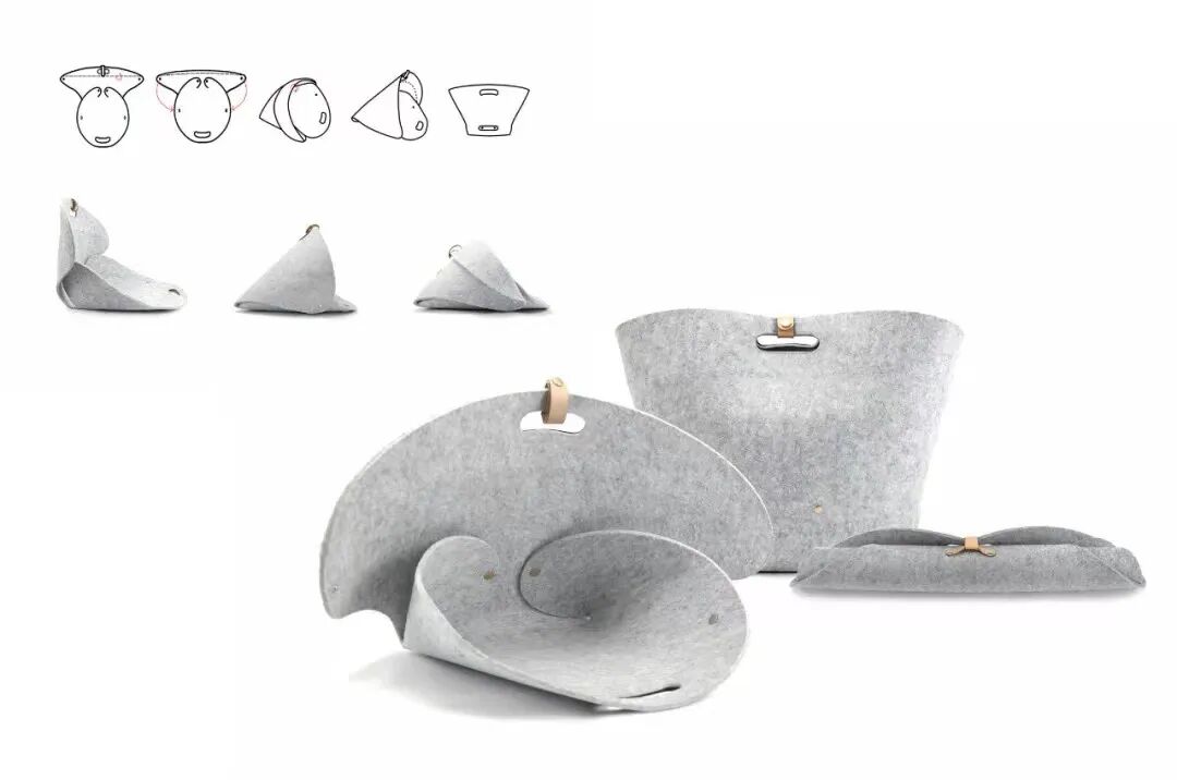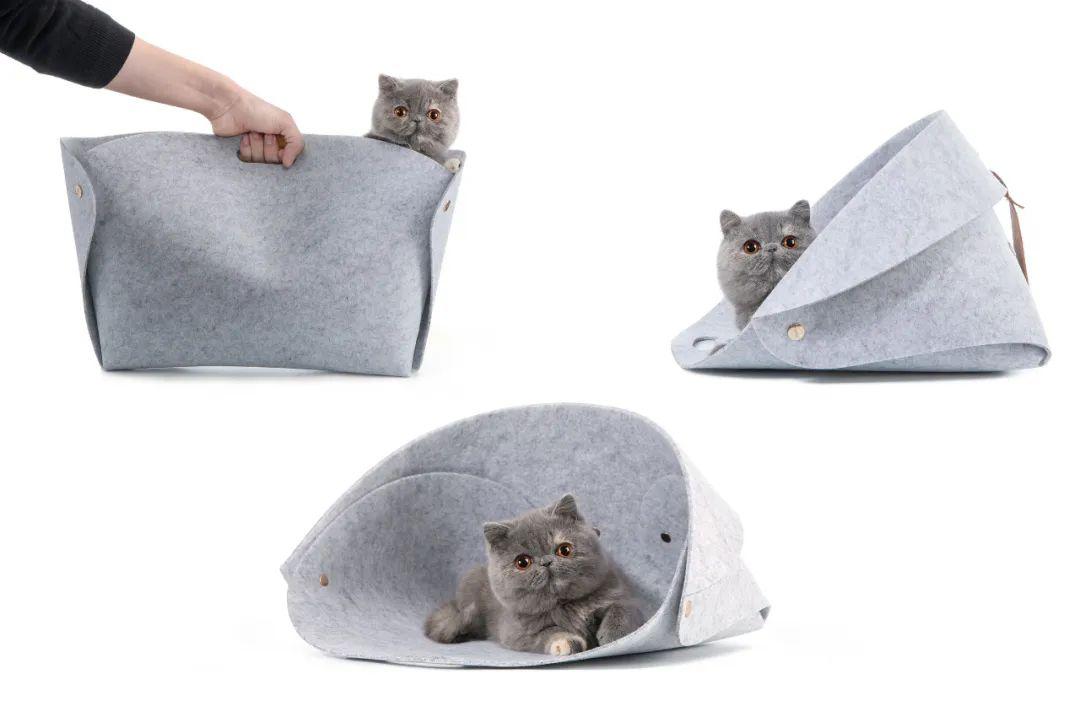 Mingdu Design明渡设计创始人梁晨以折纸为灵感,设计而成的多功能宠物窝PICA,其由毛毡和纽扣组成,可以轻松变换出不同形态。