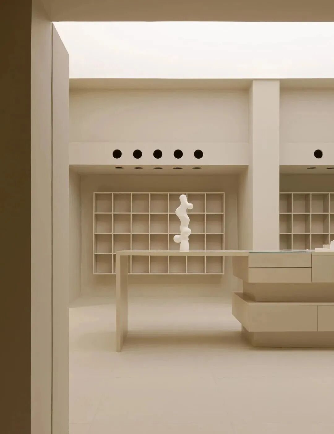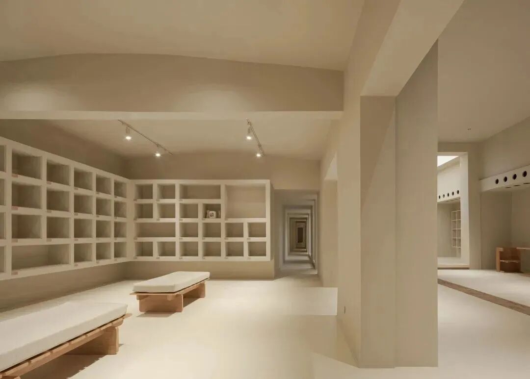 寄存室内的开放格根据墙体结构做出调整,最大程度丰富储存功能的空间体量,或大或小的结构并未按照规则排布,塑造出深层的叙事性和情境表达。