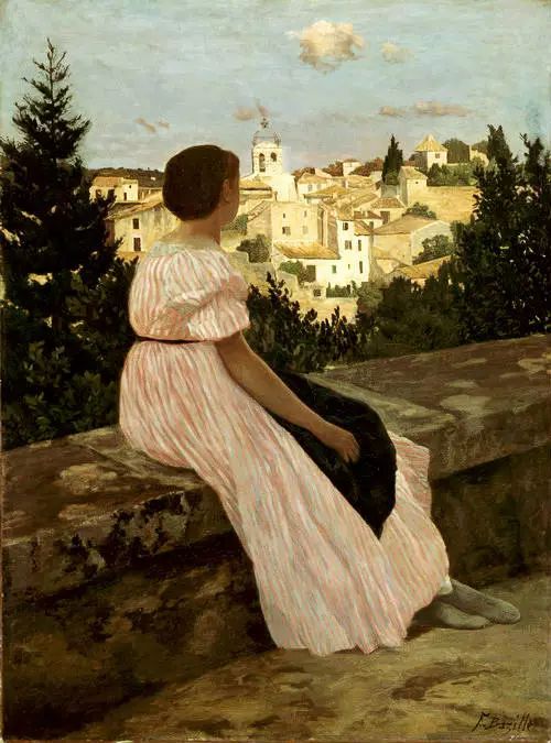 他的家乡,阳光充足,因光照情况不同而造成的明暗区域划分明显。从1864年起,他在家乡的室外开始画人物(《粉色的裙子》,1864,奥赛博物馆),在研究如何把人物融入风景方面,远远走在他的艺术家朋友们的前面。早在1870年,他在书信中就提出在官方画展之外另为年轻画家组织画展的想法。可惜,他于1870年11月战死在博讷拉罗朗德,过早地离开人间,因此未能加入印象派画家的探索队伍。