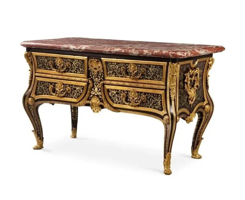 巴黎兰伯特酒店近期释出一批藏品,其中一件路易十四时期镶嵌边柜以2,213,000欧元(约合人民币15,479,160元)重磅成交。边柜约制作于1710-1720年,带有大理石桌板和四个黄铜镶嵌的抽屉,侧面有装饰有女性面具的手柄,四条伸展的桌腿呈兽爪造型,被列为“历史文物”。