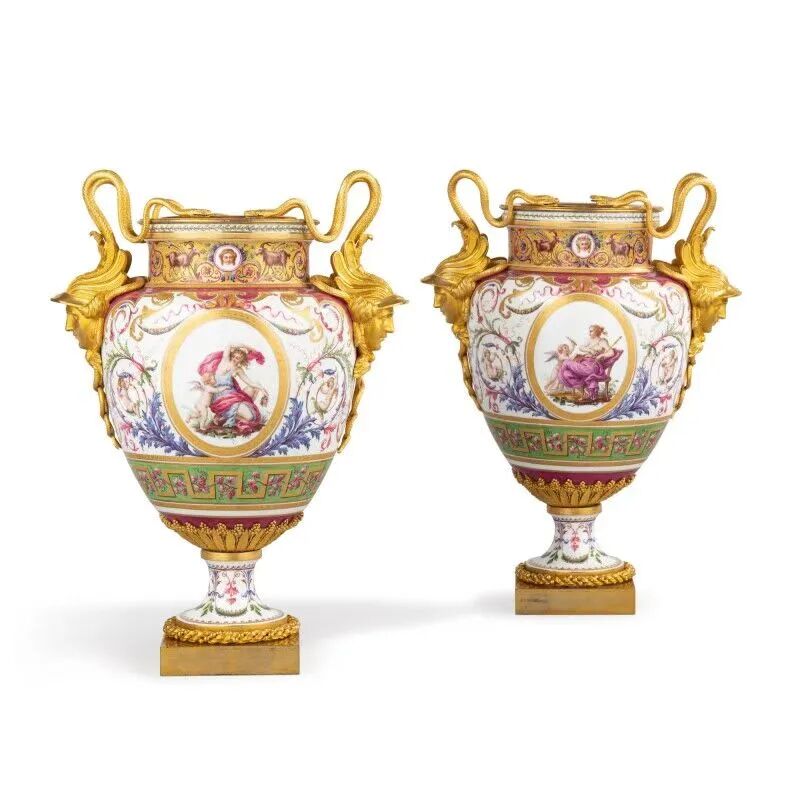 对法国官窑塞弗尔出品的铜鎏金装饰瓷器瓶本周以1,003,000欧元(约合人民币7,015,633元)成交。这对描绘着爱神丘比特的“蔓藤花纹”花瓶约诞生于1785-1786年间,曾是一项作为国王路易十六送给未来的西班牙女王阿斯图里亚斯公主外交礼物的重要委托作品,带有其创作者Jean-Jacques Lagrenée的签名。