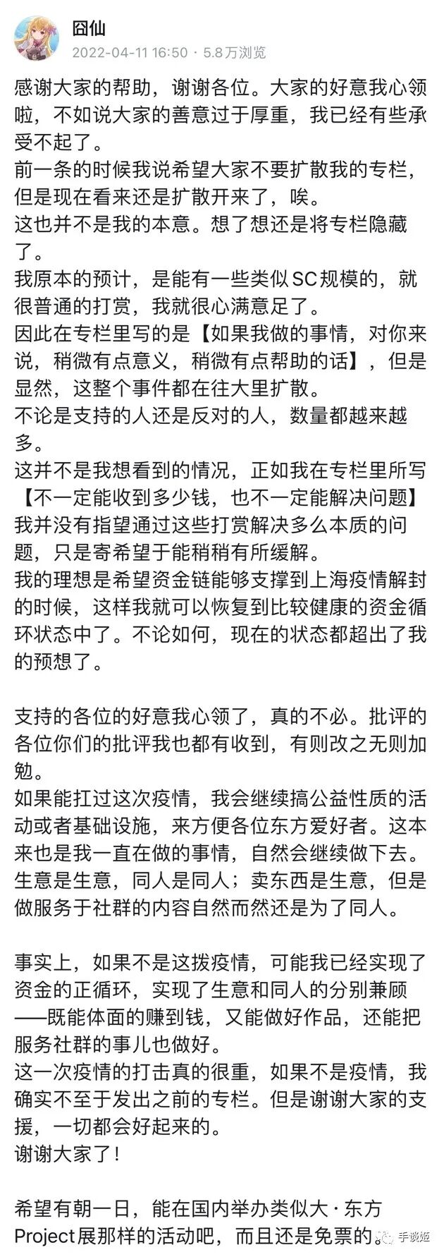 有人觉得囧仙和其团队不能倒,得多帮帮,因为在国内,东方同人社团较少,囧仙对东方的发展有诸多推动作用,包括引进相关作品,举办线下活动等等。若囧仙没了,圈子将受到重大打击。