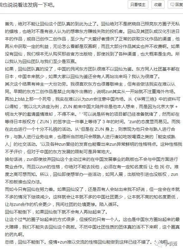 不过也有人觉得,囧仙既然已选择将爱好变商业化,脱离了用爱发电的范畴,那就得为自己的选择负责。大家支持的是东方本身,而非东方的意见领袖。既是同人活动,便会有爱好者们出头,长期由一位官方代理人来主导是一件非常稀奇古怪的事情