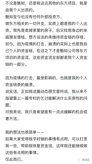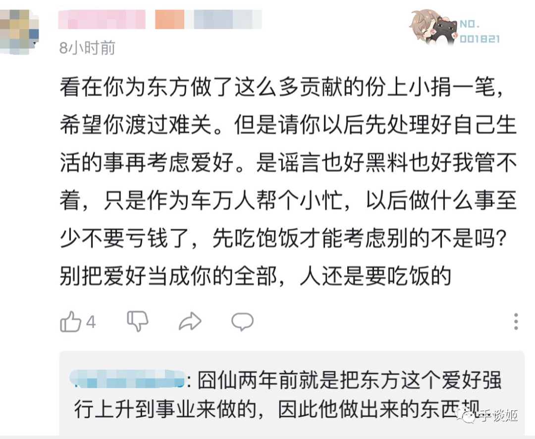 有网友说,既然你的影响力来自于东方,现在像这样来跟网友要钱,是否有借用东方名义之嫌;