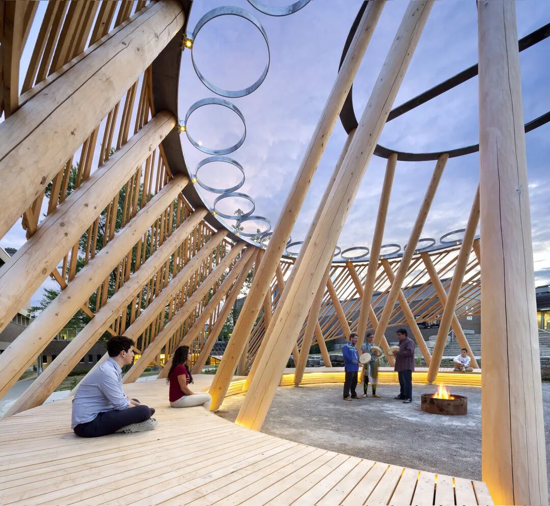 HOOP舞蹈向土著文化、传统和世界观致敬,它欢迎所有文化背景、信仰和年龄的人加入一个包容的圈子,一个教学、音乐、讲故事、有仪式感、放松和沉思的地方。莫霍克学院的新户外展馆由布鲁克麦克罗伊建筑事务所、莫霍克学院、学院原住民学生、新信用第一民族社区的六国第一民族、密西沙加的长老和成员合作设计完成。