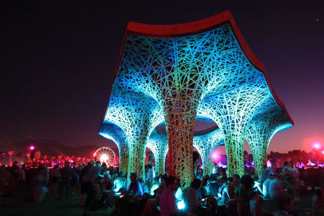 纸浆音乐馆研究使用了再生纸的复合材料,这是一个聚集空间,可以让人从加利福尼亚沙漠的科切拉谷音乐和艺术节的阳光和狂热能量中得到休息,因此也是观看两个舞台表演的理想场所。