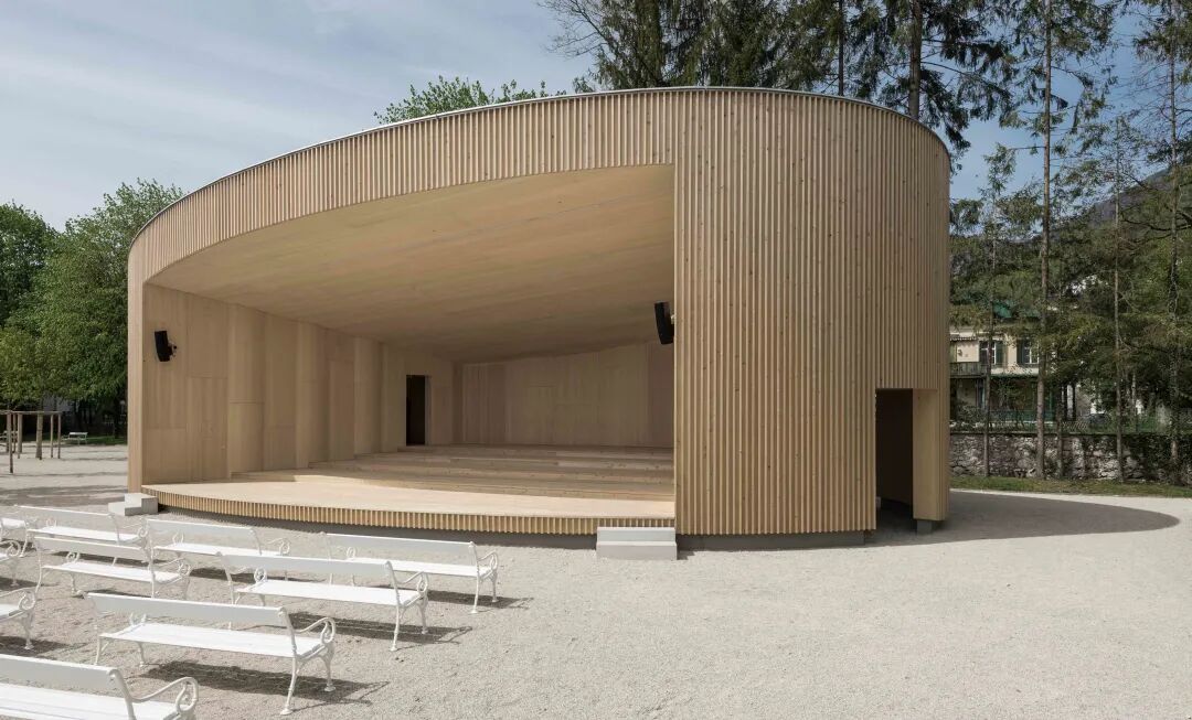 这座音乐馆于2014年夏天在温泉花园 (Kurpark) 的场地内建成,它展示了个性、设计和生态之间的兼容性,使用国内可再生木材证明了这一点,展馆的基本椭圆形状源于温泉花园的城市规划情况,与周围环境和谐融合。为艺术家设计的入口由与主椭圆相切的第二个椭圆组成,为了获得最有利的声音传播条件,主屋顶选择了向后倾斜的屋顶形状,进一步强调了建筑的动态。