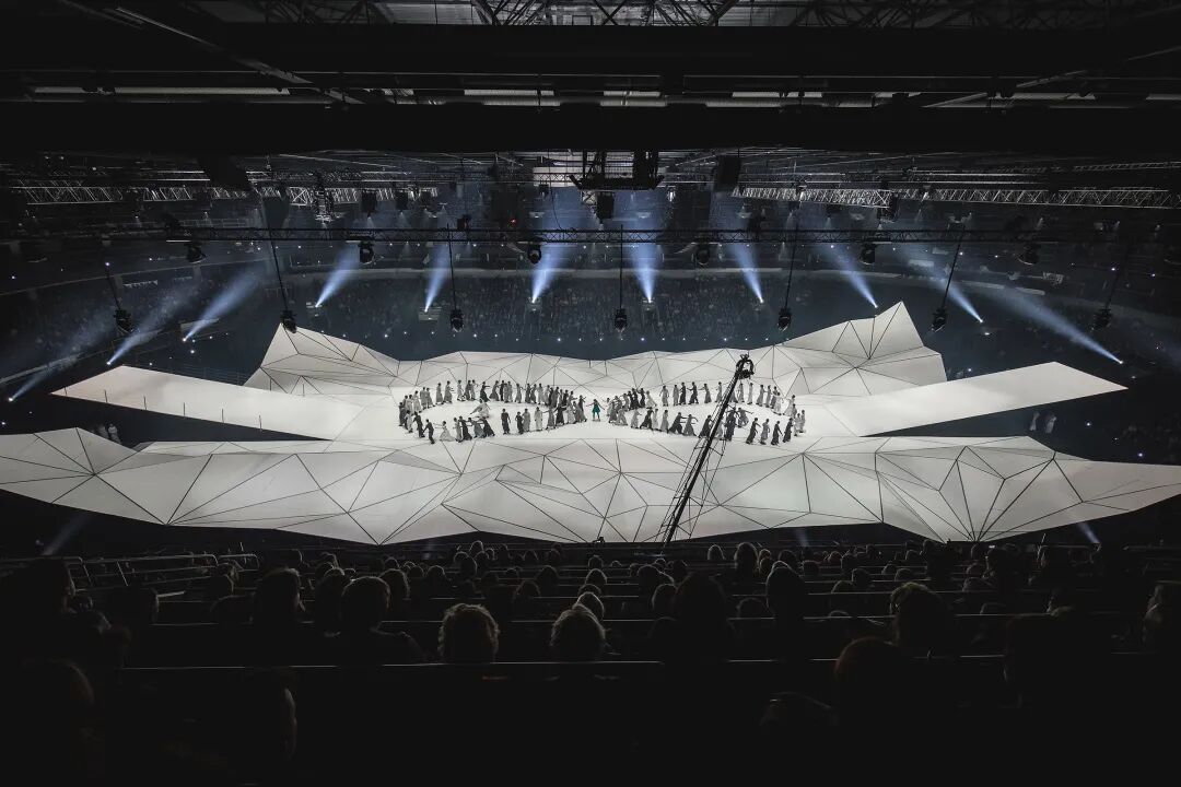 这个舞台用于拉脱维亚百年庆典的高潮活动,可以用于多媒体舞蹈表演,用音乐、舞蹈、场景设计、视频和灯光投影,讲述拉脱维亚崛起的故事和过去一百年的经历。200平方米的大舞台是拉脱维亚国旗的形状,国旗不仅用作国家的象征,还用作空间制造元素,它为舞者群体的大型场景和独奏者的较小空间创造了舞池,场景的多边形表面还用作展示拉脱维亚历史照片和视频的巨大视频投影屏幕。