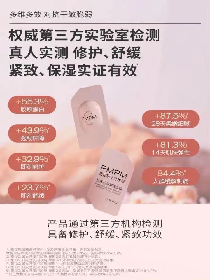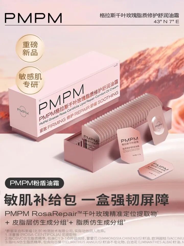 近日,PMPM「探索格拉斯花谷 · 粉盾油霜」重磅上新。聚焦敏感肌群体面霜品类需求痛点,延续PMPM内外源双通路配方思路,PMPM新品「粉盾油霜」以品牌独家专研原料RosaRepair™千叶玫瑰精准定位提取物为核心,加乘「两大仿生成分组」模拟皮肤皮脂层及脂质,从内而外仿生修护,高渗透、深滋润、韧屏障。产品使用无污染次抛设计,“一片”舒缓急救,30分钟即刻修护;“一盒”周期性改善敏感,28天强韧肌肤屏障。经中国检疫检验科学院等权威机构证明,产品集舒缓、修护、褪红、保湿、紧致5大维度功效,为敏感肌群体提供“一盒多效”的创新解决方案。