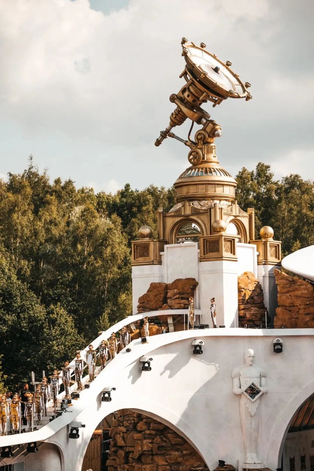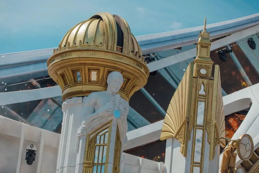 整个舞台的内容装饰非常精致,细节满满,具有神圣气息的雕像,不同规格的星球仪,水晶塔。后疫情时代明日世界是什么样的?Ttomorrowland的舞美团队用建筑造型、细节装置、演员参与等一系列的手段表现出来。明日已至,这已经不只是一场音乐节,而是一场科技的明日之秀。