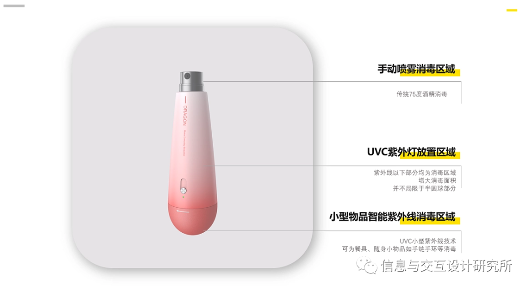 “减”的装饰元素采用简洁流畅的线条和朴素装饰形状,抛弃了原始繁琐而复杂的设计元素,并使用留白设计营造产品在空间的个性与宁静。在材料上,消毒器整体使用可降解塑料和优质的石英玻璃管, “减”以白色为主,加以黑色点缀,简单优雅。一键式消毒,人性化设计在“减”中无处不在,从时间延伸到空间,从物质世界升华到精神世界。