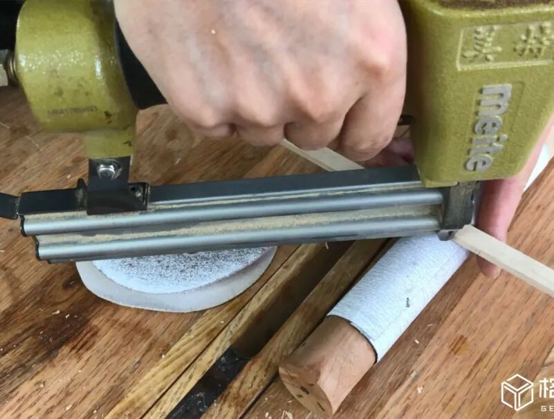 用一张砂纸包住一根圆木棒的外表面(圆木棒直径与倒圆角相同),用气钉枪固定,进行打磨。