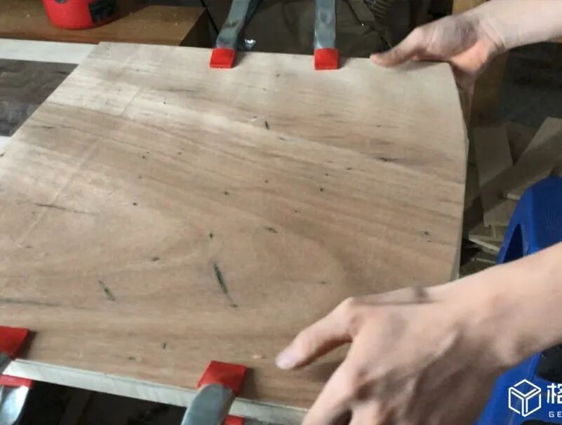 先在拼接界面涂上白乳胶(包括榫眼),然后在黑胡桃拼板拼接界面插上木榫(做榫头),最后把几块面板组装起来,用夹具固定。