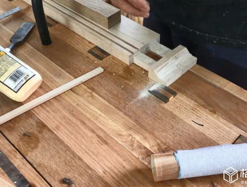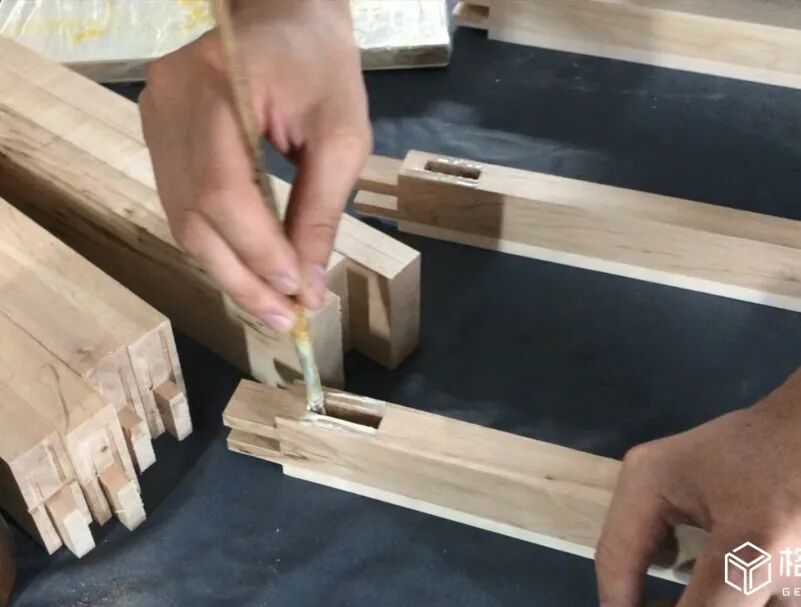 最后,在桌腿的榫头和榫眼处涂上白乳胶,将侧面板组装到桌腿上。