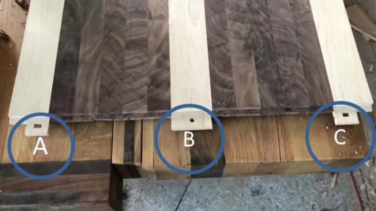 注!A、C区采用方孔,且不需要上胶水,其原因在于,季节变化会使桌面产生缩胀力,为了应对桌面缩胀的应力而采用方孔,此外,如果3个区域全部上胶水,会使得木材的缩胀力无法释放,导致开裂等。只在B区上胶水,既能固定桌面,又能使木头能自由伸缩,保证桌面更长的使用寿命。