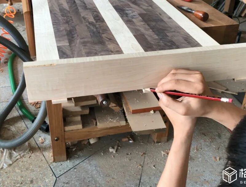 由于制作半透燕尾榫,需要先用自制划线具在黑胡桃面板的左右两端部划线,对燕尾榫的深度进行定位。