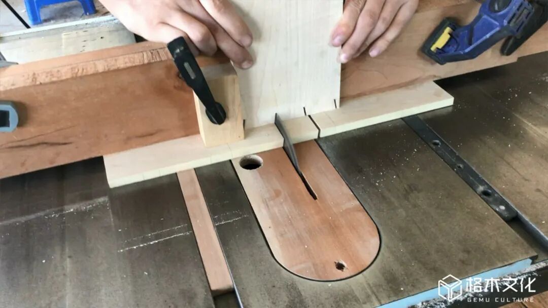 正式拼板时,用立铣在木板的侧边铣出榫槽,枫木板与黑胡桃拼板用饼干榫连接。