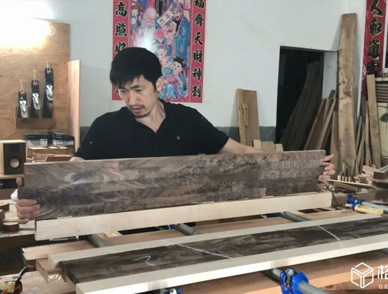 接着,在每块黑胡桃木条的拼接界面上涂抹白乳胶,这里需要注意,在胶合前先把木条进行预拼接,然后逐个上胶拼接,避免木条拼接错误。