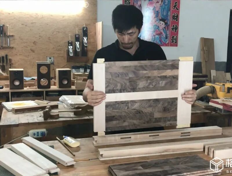先组装两块胡桃木拼板和三块枫木板条,形成一组侧面板。