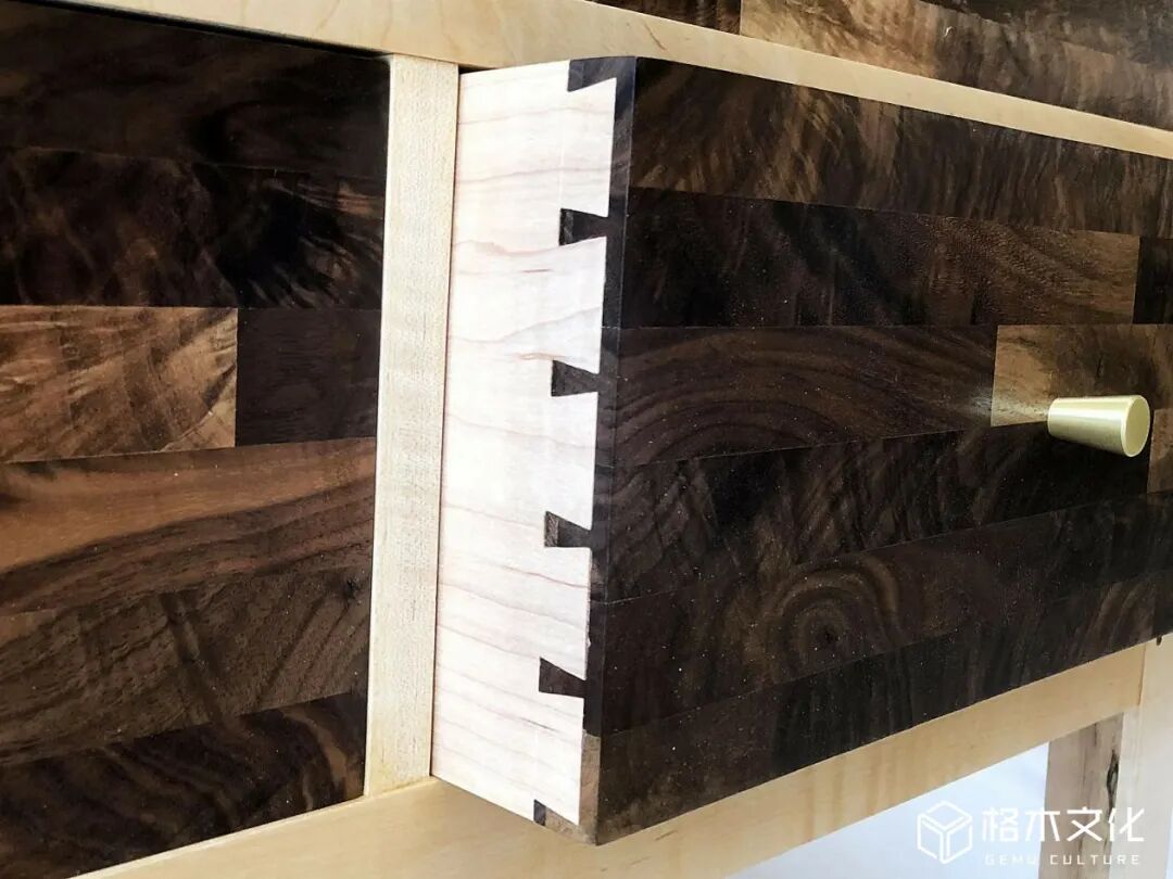 柜体的框架选用的是虎纹枫木的整板材料,在颜色上与黑胡桃形成了“撞色”的强烈对比。技艺结构上,使用传统的榫卯结构进行接合,弥补了黑胡桃边角料结构上的不稳定性。
